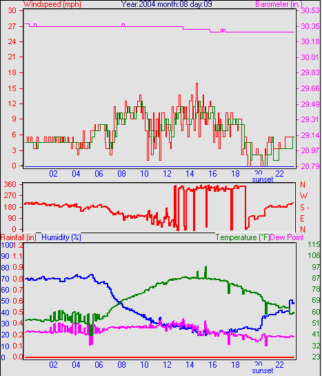 Averages\Extremes for the month of August to 29 2004 --------------------------------------------------- Average temperature 67.7 °F (19.8 °C) Average humidity 54 % Average dewpoint 48.2 °F (9.0 °C) Average barometer 30.205 in. Average windspeed 4.9 mph Average gustspeed 4.9 mph Average direction 288 ° (WNW) Rainfall for month 2.707 in. (68 mm) Rainfall for year 19.885 in. (497 mm) ----------------------------------------------------------- Maximum rain per minute 0.000 in. ( 0 mm) on day 29 at time 23:56 Maximum temperature 103.6 °F (39.8 °C) on day 13 at time 10:49 Minimum temperature 32.0 °F (0.0 °C) on day 22 at time 16:13 Maximum humidity 95 % on day 25 at time 10:03 Minimum humidity 5 % on day 22 at time 16:13 Minimum pressure 29.905 in. on day 22 at time 20:51 Maximum pressure 30.466 in. on day 08 at time 13:48 Maximum windspeed 23.0 mph from 200 on day 02 at time 18:07 Maximum gust speed 32.0 mph from 035 on day 04 at time 20:15 Maximum heat index 107.6 °F (42.0 °C)on day 21 at time 11:52 Growing degrees days : 623.5 °F Sunshine hours year to date= 0.0 hrs ------------------------------------------------------------ Daily rain totals 0.04 in. (1.1 mm) on day 1 0.07 in. (1.8 mm) on day 2 0.06 in. (1.4 mm) on day 3 0.01 in. (0.4 mm) on day 4 0.37 in. (9.2 mm) on day 5 0.01 in. (0.4 mm) on day 6 0.01 in. (0.4 mm) on day 18 0.60 in. (14.9 mm) on day 21 0.37 in. (9.2 mm) on day 22 0.44 in. (11.0 mm) on day 23 0.72 in. (18.1 mm) on day 24 ------------------------------------------------------------