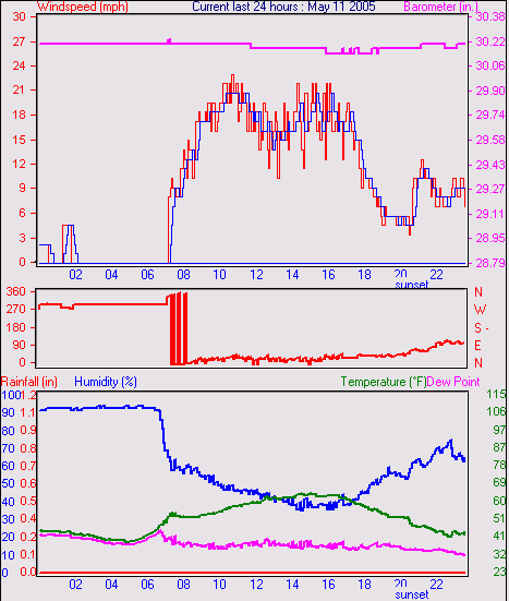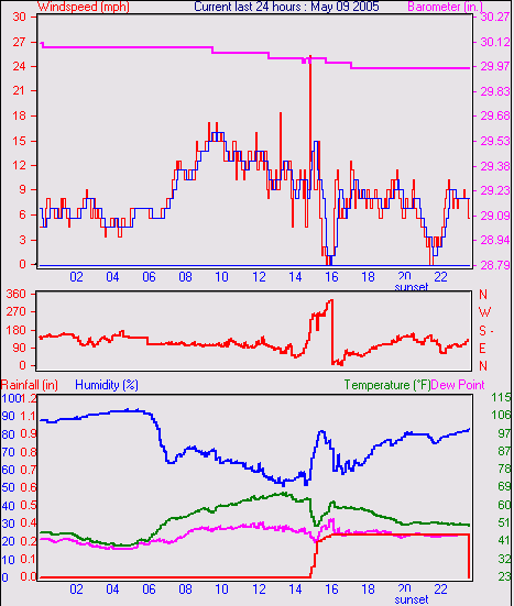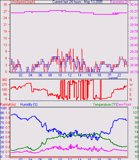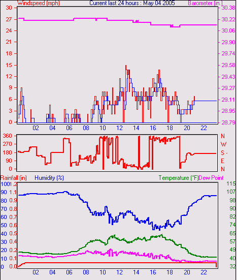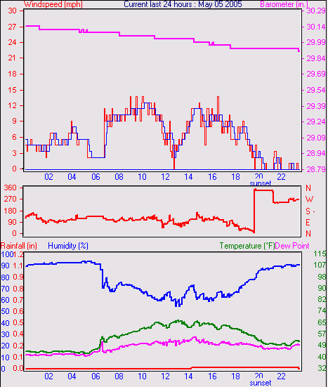 Averages\Extremes for the month of May to 31 2005 --------------------------------------------------- Average temperature 53.1 °F (11.7 °C) Average humidity 69 % Average dewpoint 41.9 °F (5.5 °C) Average barometer 30.137 in. Average windspeed 5.8 mph Average gustspeed 5.8 mph Average direction 78 ° (ENE) Rainfall for month 6.647 in. (166 mm) Rainfall for year 13.011 in. (325 mm) ----------------------------------------------------------- Maximum rain per minute 0.000 in. ( 0 mm) on day 31 at time 23:59 Maximum temperature 89.4 °F (31.9 °C) on day 28 at time 18:55 Minimum temperature 0.7 °F (-17.4 °C) on day 30 at time 08:52 Maximum humidity 95 % on day 24 at time 03:30 Minimum humidity 20 % on day 29 at time 16:42 Minimum pressure 29.787 in. on day 16 at time 19:27 Maximum pressure 30.525 in. on day 25 at time 09:47 Maximum windspeed 23.0 mph from 240 on day 18 at time 19:49 Maximum gust speed 29.0 mph from 235 on day 18 at time 19:29 Maximum heat index 86.4 °F (30.2 °C)on day 28 at time 18:55 Growing degrees days : 378.2 °F ------------------------------------------------------------ Daily rain totals 0.028 in. (0.7 mm) on day 1 0.057 in. (1.4 mm) on day 2 0.241 in. (6.0 mm) on day 3 0.014 in. (0.4 mm) on day 4 1.545 in. (38.6 mm) on day 6 0.283 in. (7.1 mm) on day 7 0.411 in. (10.3 mm) on day 8 0.567 in. (14.2 mm) on day 9 0.113 in. (2.8 mm) on day 13 0.312 in. (7.8 mm) on day 14 1.162 in. (29.1 mm) on day 16 0.085 in. (2.1 mm) on day 17 0.780 in. (19.5 mm) on day 18 0.213 in. (5.3 mm) on day 19 0.043 in. (1.1 mm) on day 20 0.609 in. (15.2 mm) on day 21 ------------------------------------------------------------