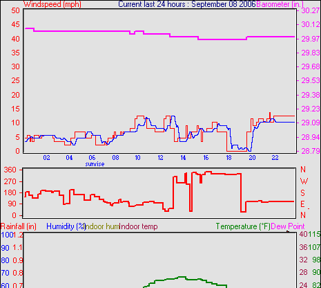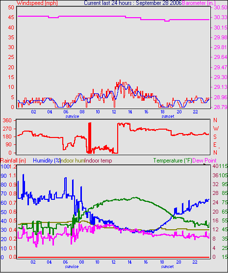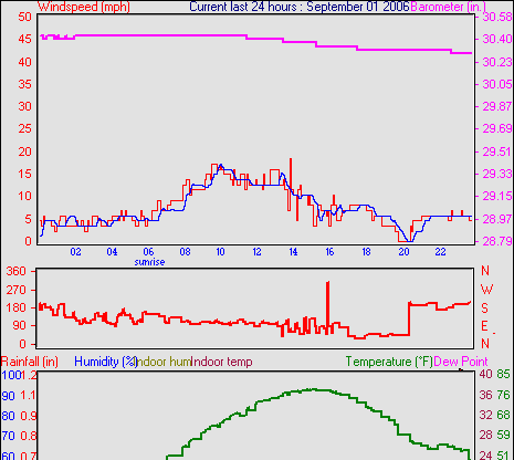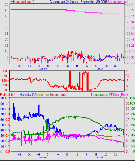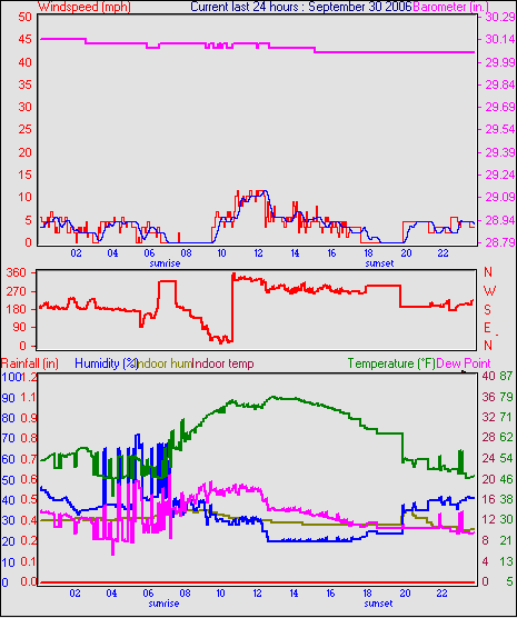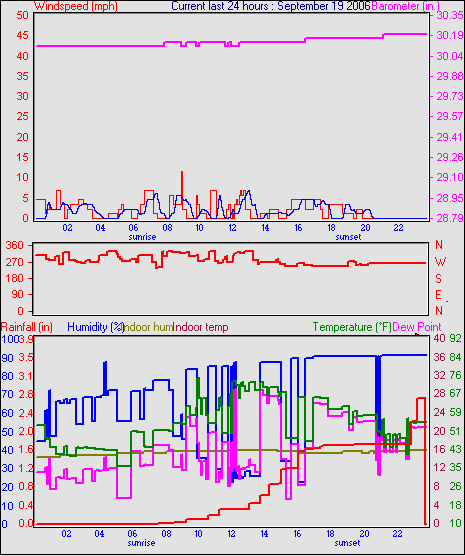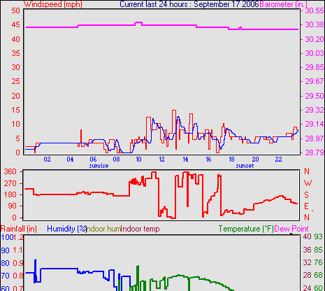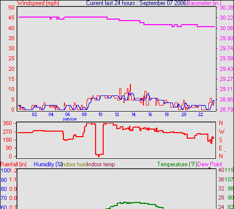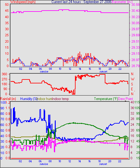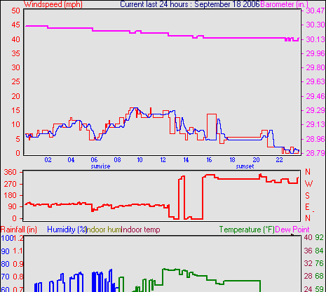 Averages\Extremes for the month of September to 30 2006 --------------------------------------------------- Average temperature 68.2 °F (20.1 °C) Average humidity 58 % Average dewpoint 43.5 °F (6.4 °C) Average barometer 34.879 in. Average windspeed 5.7 mph Average gustspeed 5.7 mph Average direction 303 ° (WNW) Rainfall for month 4.734 in. (118 mm) Rainfall for year 22.663 in. (567 mm) ----------------------------------------------------------- Maximum rain per minute 0.000 in. ( 0 mm) on day 30 at time 23:58 Maximum temperature 91.8 °F (33.2 °C) on day 05 at time 14:16 Minimum temperature 32.7 °F (0.4 °C) on day 15 at time 02:25 Maximum humidity 94 % on day 21 at time 07:07 Minimum humidity 20 % on day 30 at time 17:22 Minimum pressure 29.846 in. on day 15 at time 04:58 Maximum pressure 30.466 in. on day 24 at time 11:58 Maximum windspeed 22.0 mph from 245 on day 21 at time 19:58 Maximum gust speed 25.0 mph from 315 on day 09 at time 15:37 Maximum heat index 88.1 °F (31.2 °C)on day 05 at time 14:16 Growing degrees days : 476.6 °F ------------------------------------------------------------ Daily rain totals 0.028 in. (0.7 mm) on day 1 0.043 in. (1.1 mm) on day 12 0.071 in. (1.8 mm) on day 13 2.679 in. (67.0 mm) on day 18 0.028 in. (0.7 mm) on day 19 0.014 in. (0.4 mm) on day 20 ------------------------------------------------------------