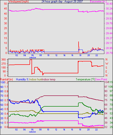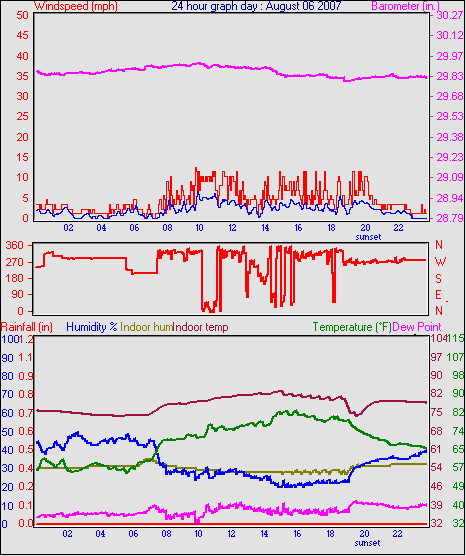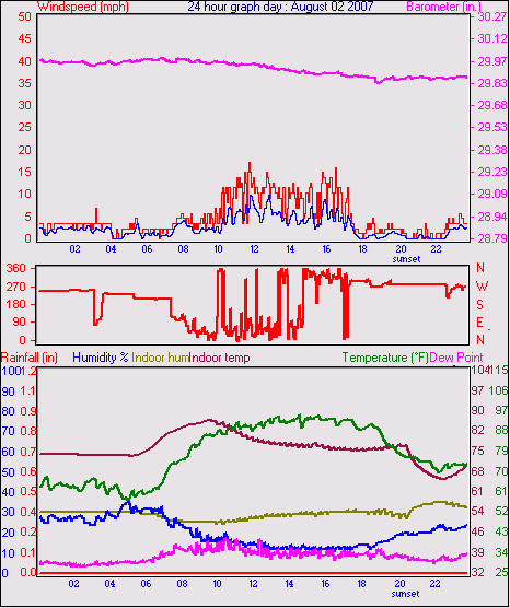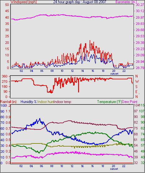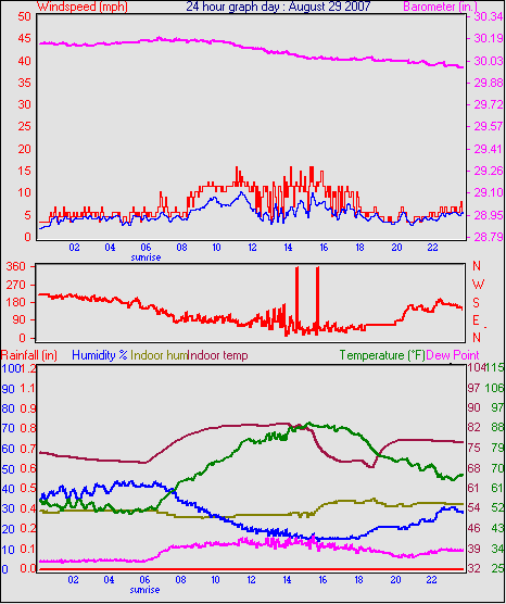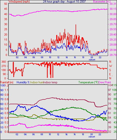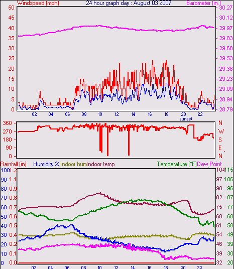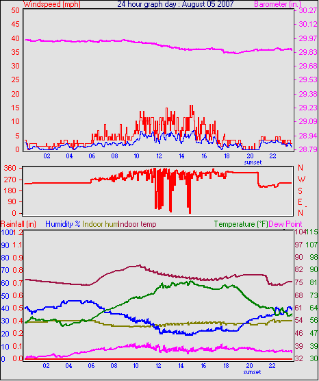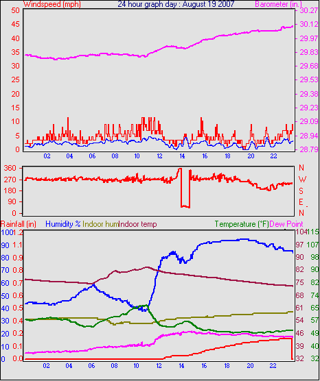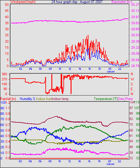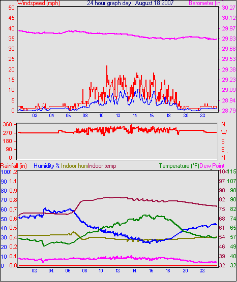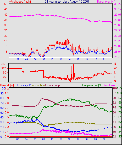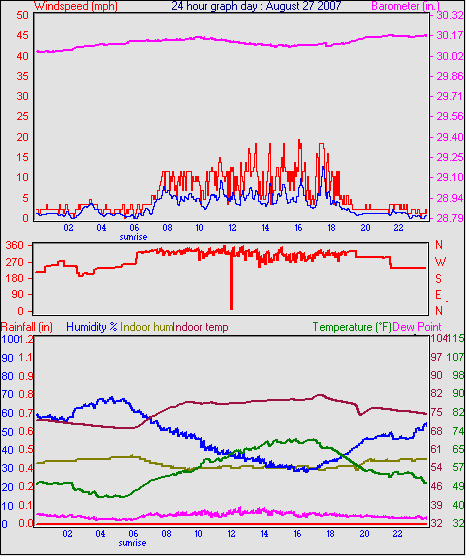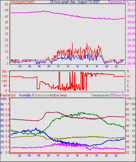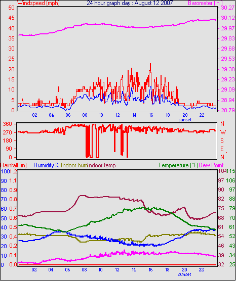 Averages\Extremes for the month of August to 31 2007 ------------------------------------------------------------ Average temperature 66.3 °F Average humidity 39 % Average dewpoint 37.8 °F Average barometer 29.98 in. Average windspeed 3.4 mph Average gustspeed 5.0 mph Average direction 307 ° ( NW) Rainfall for month 0.02 in. Rainfall for year 8.51 in. ----------------------------------------------------------- Maximum rain per minute 0.01 in. on day 19 at time 21:54 Maximum temperature 95.7 °F on day 15 at time 14:34 Minimum temperature 43.9 °F on day 27 at time 04:58 Maximum humidity 96 % on day 20 at time 00:40 Minimum humidity 10 % on day 15 at time 15:18 Maximum pressure 30.25 in. on day 28 at time 07:08 Minimum pressure 29.71 in. on day 16 at time 02:59 Maximum windspeed 23.0 mph from 338° on day 26 at time 14:58 Maximum gust speed 29.9 mph from 306° on day 10 at time 16:29 Maximum heat index 90.9 °F on day 15 at time 14:34 Growing degrees days : 514.5 °F ------------------------------------------------------------ Daily rain totals 0.19 in. on day 19 0.14 in. on day 20 0.11 in. on day 21 0.05 in. on day 22 0.01 in. on day 23 0.05 in. on day 31 ------------------------------------------------------------
