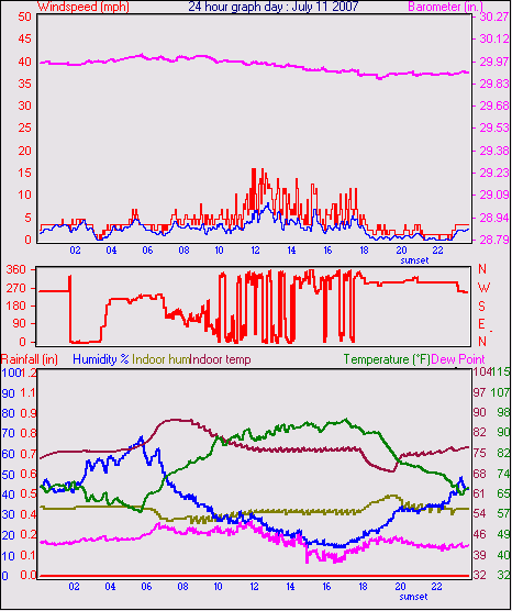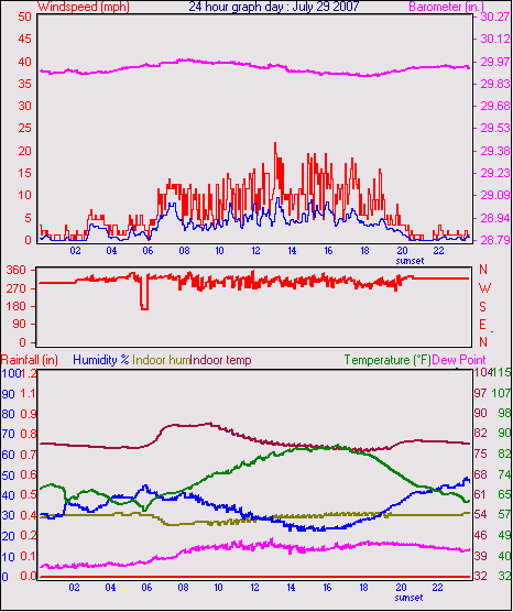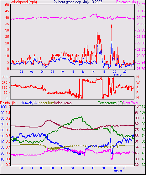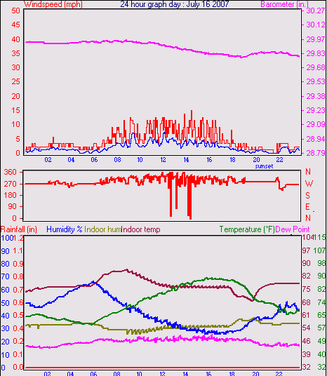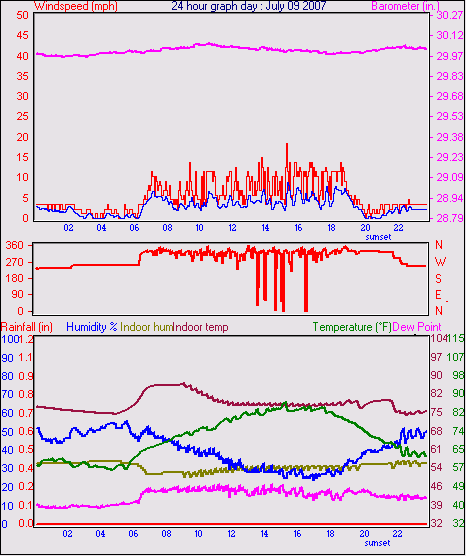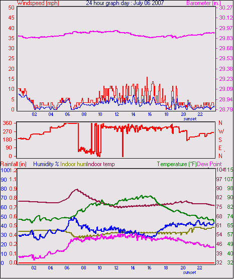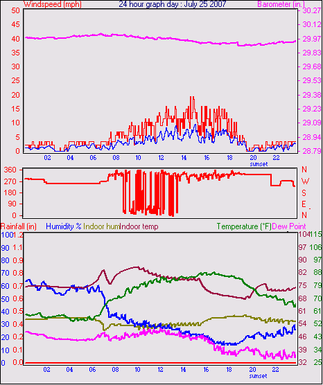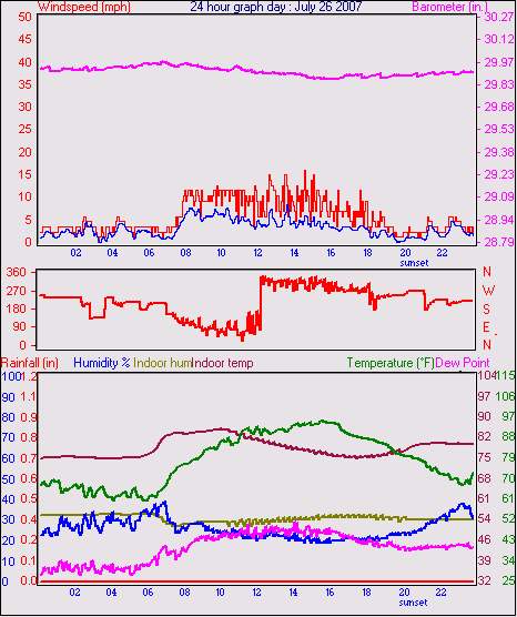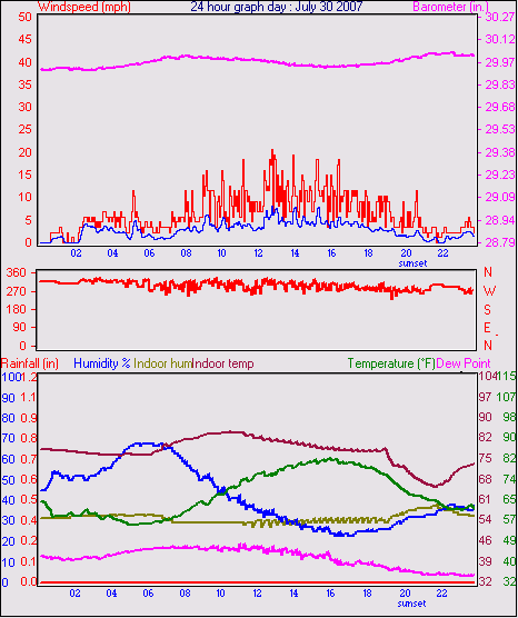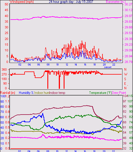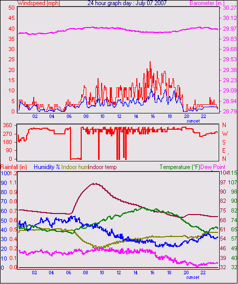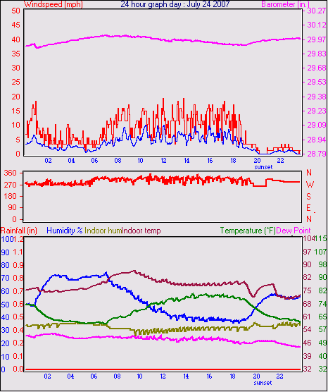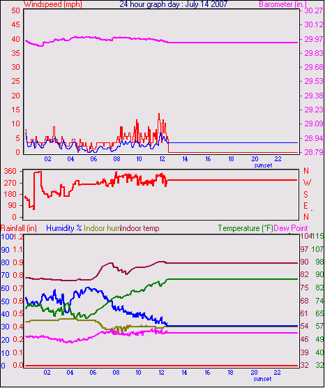 Averages\Extremes for the month of July to 31 2007 ------------------------------------------------------------ Average temperature 74.4 °F Average humidity 40 % Average dewpoint 46.5 °F Average barometer 29.96 in. Average windspeed 3.1 mph Average gustspeed 4.3 mph Average direction 306 ° ( NW) Rainfall for month 0.00 in. Rainfall for year 7.96 in. ----------------------------------------------------------- Maximum rain per minute 0.01 in. on day 17 at time 17:49 Maximum temperature 103.9 °F on day 05 at time 16:40 Minimum temperature 49.2 °F on day 31 at time 04:03 Maximum humidity 82 % on day 19 at time 06:29 Minimum humidity 12 % on day 05 at time 16:41 Maximum pressure 30.26 in. on day 03 at time 05:41 Minimum pressure 29.74 in. on day 18 at time 08:44 Maximum windspeed 28.8 mph from 137° on day 13 at time 19:44 Maximum gust speed 34.5 mph from 137° on day 13 at time 19:44 Maximum heat index 102.3 °F on day 05 at time 14:18 Growing degrees days : 683.6 °F ------------------------------------------------------------ Daily rain totals 0.01 in. on day 17 ------------------------------------------------------------