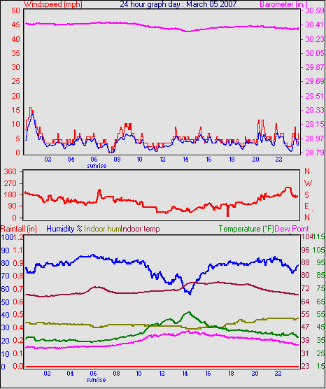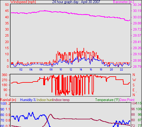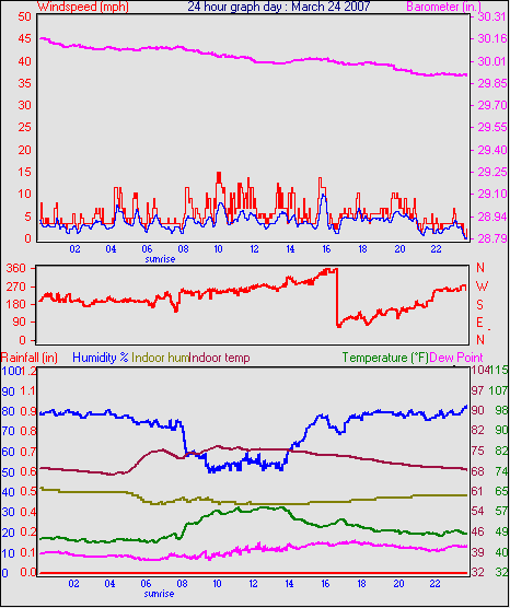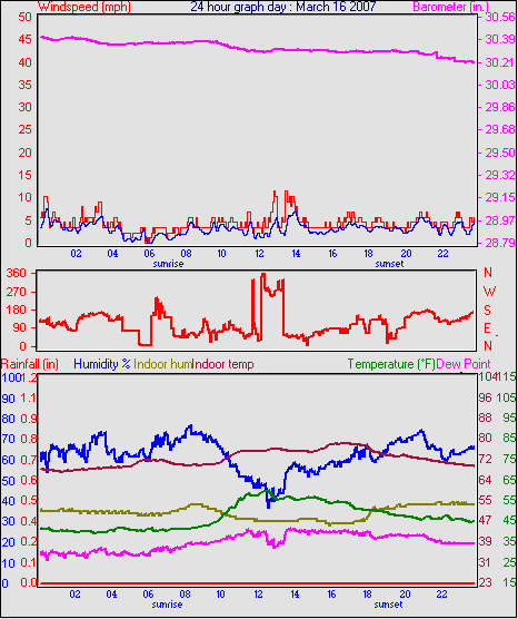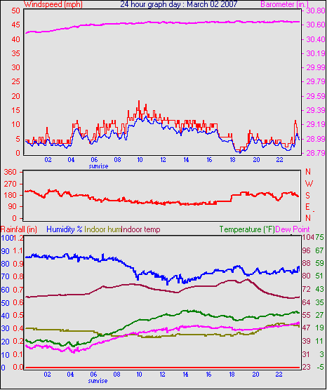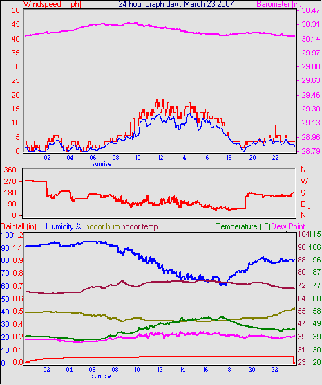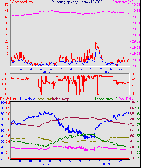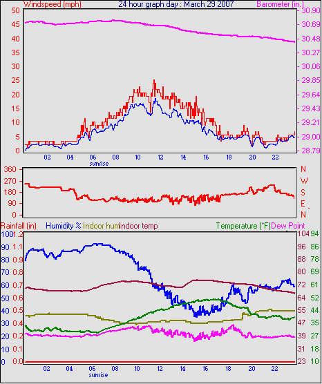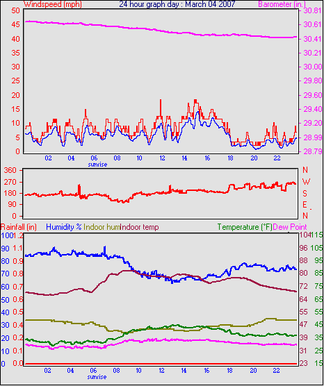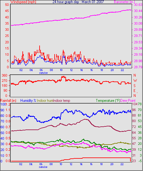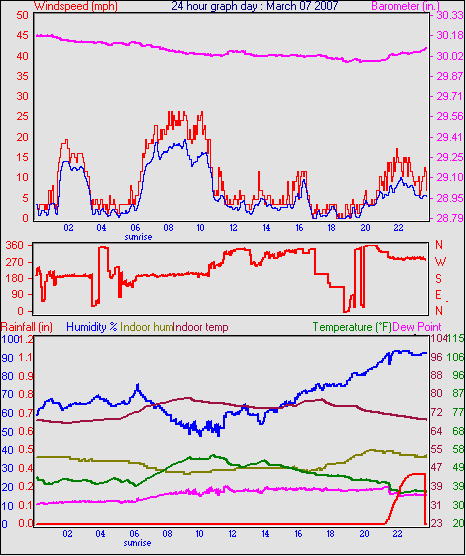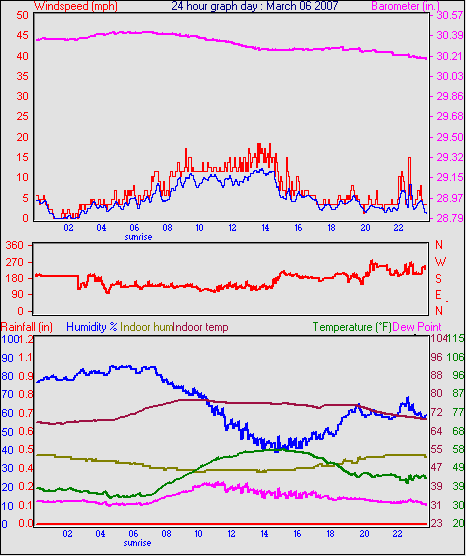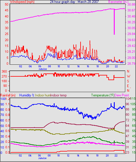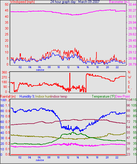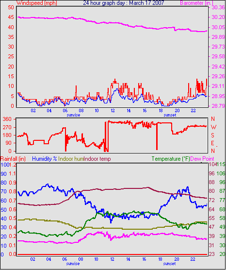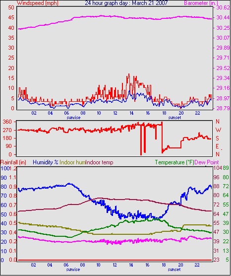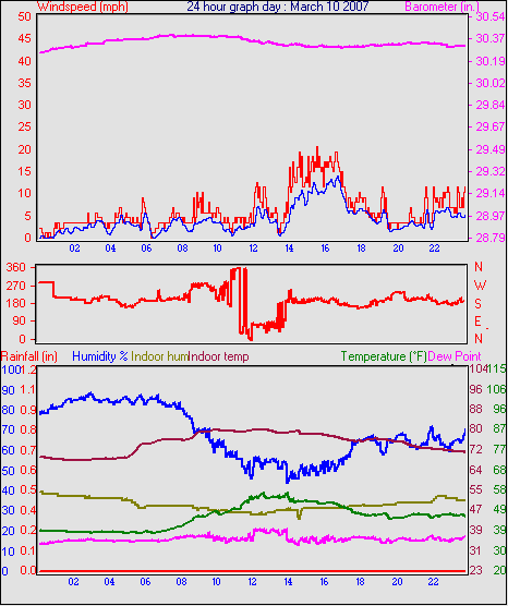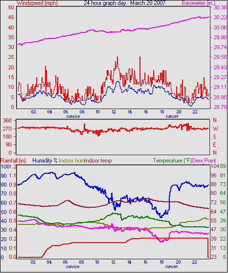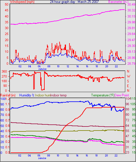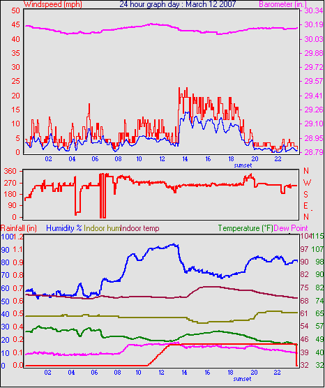 Averages\Extremes for the month of March to 31 2007 ------------------------------------------------------------ Average temperature 40.9 °F Average humidity 73 % Average dewpoint 32.2 °F Average barometer 30.27 in. Average windspeed 4.2 mph Average gustspeed 5.7 mph Average direction 199 ° (SSW) Rainfall for month 0.10 in. Rainfall for year 4.11 in. ----------------------------------------------------------- Maximum rain per minute 0.01 in. on day 25 at time 19:19 Maximum temperature 66.9 °F on day 19 at time 11:58 Minimum temperature 7.8 °F on day 02 at time 04:38 Maximum humidity 100 % on day 25 at time 09:21 Minimum humidity 34 % on day 18 at time 15:43 Maximum pressure 30.76 in. on day 29 at time 08:02 Minimum pressure 29.74 in. on day 19 at time 23:13 Maximum windspeed 24.2 mph from 203° on day 07 at time 09:16 Maximum gust speed 28.8 mph from 203° on day 07 at time 09:16 Maximum heat index 79.1 °F on day 17 at time 15:19 Growing degrees days : 52.5 °F ------------------------------------------------------------ Daily rain totals 0.07 in. on day 1 0.01 in. on day 3 0.32 in. on day 7 0.04 in. on day 11 0.20 in. on day 12 0.25 in. on day 20 0.09 in. on day 22 0.06 in. on day 23 0.99 in. on day 25 0.21 in. on day 27 0.05 in. on day 28 0.17 in. on day 31 ------------------------------------------------------------