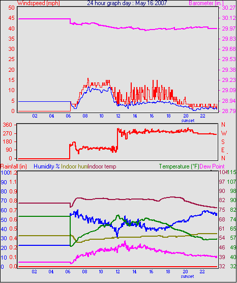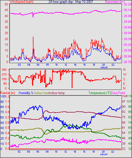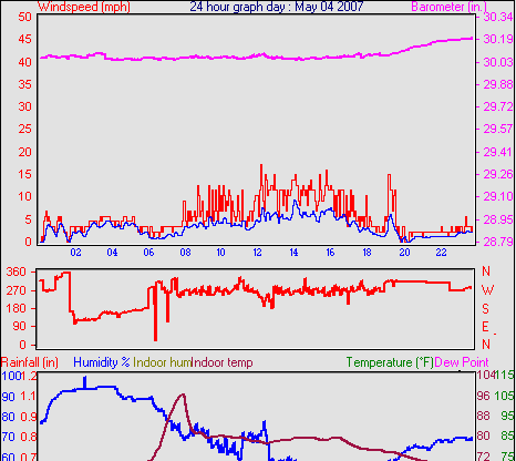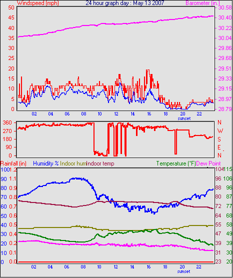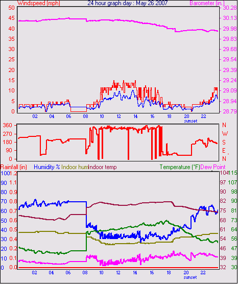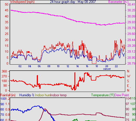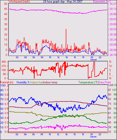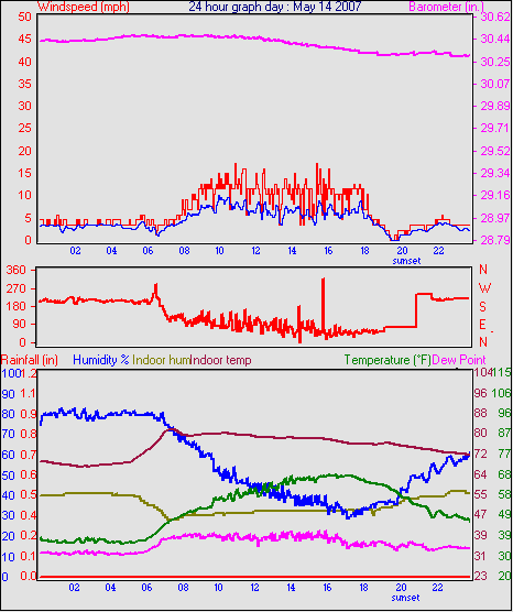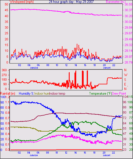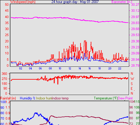 Averages\Extremes for the month of May to 31 2007 ------------------------------------------------------------ Average temperature 52.9 °F Average humidity 62 % Average dewpoint 38.6 °F Average barometer 30.12 in. Average windspeed 3.7 mph Average gustspeed 4.9 mph Average direction 305 ° ( NW) Rainfall for month 0.04 in. Rainfall for year 6.81 in. ----------------------------------------------------------- Maximum rain per minute 0.01 in. on day 21 at time 23:26 Maximum temperature 82.7 °F on day 08 at time 14:08 Minimum temperature 29.6 °F on day 04 at time 05:55 Maximum humidity 100 % on day 04 at time 02:55 Minimum humidity 18 % on day 08 at time 15:40 Maximum pressure 30.47 in. on day 14 at time 11:06 Minimum pressure 29.81 in. on day 02 at time 05:11 Maximum windspeed 23.0 mph from 051° on day 22 at time 18:30 Maximum gust speed 25.3 mph from 174° on day 24 at time 14:06 Maximum heat index 80.8 °F on day 08 at time 14:07 Growing degrees days : 241.5 °F ------------------------------------------------------------ Daily rain totals 0.29 in. on day 2 0.03 in. on day 3 0.01 in. on day 4 0.06 in. on day 20 0.26 in. on day 21 0.25 in. on day 22 0.14 in. on day 27 0.03 in. on day 28 0.01 in. on day 29 ------------------------------------------------------------