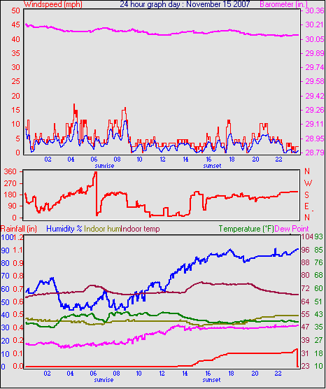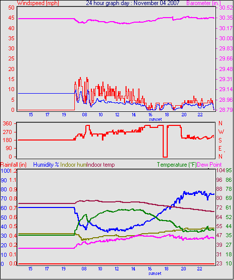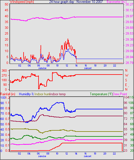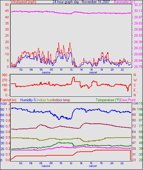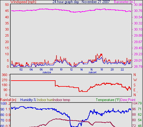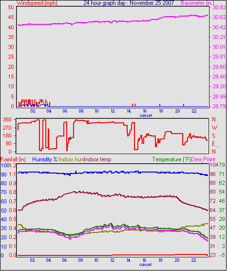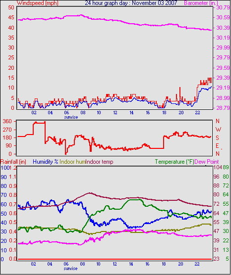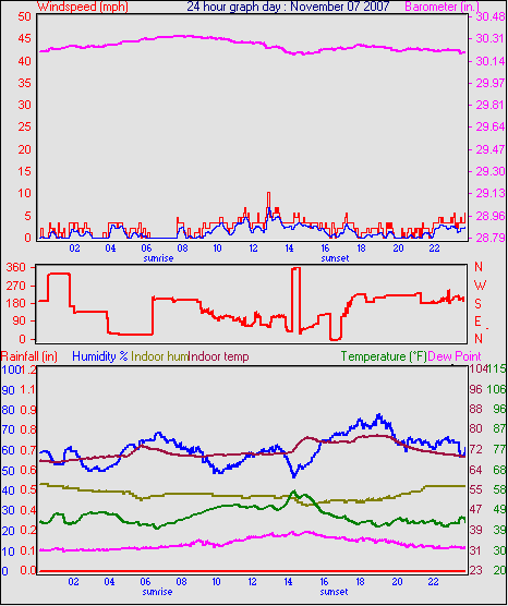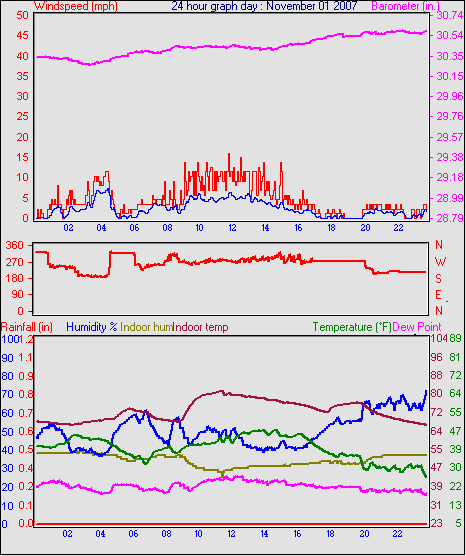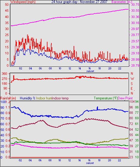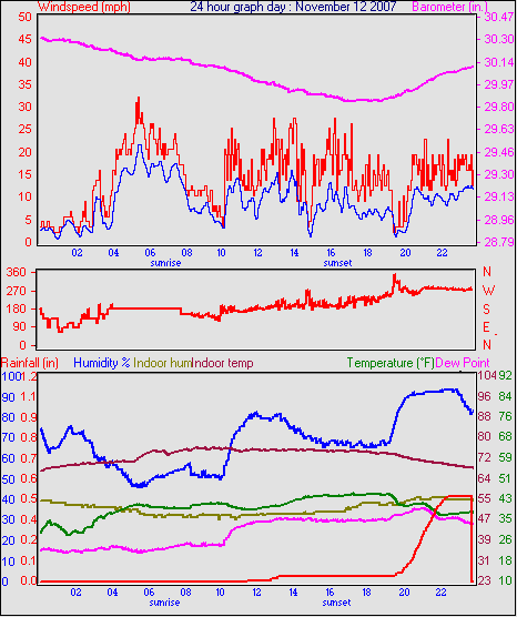 Averages\Extremes for the month of November to 28 2007 ------------------------------------------------------------ Average temperature 35.3 °F Average humidity 75 % Average dewpoint 27.2 °F Average barometer 30.34 in. Average windspeed 3.0 mph Average gustspeed 3.6 mph Average direction 192 ° (SSW) Rainfall for month 1.91 in. Rainfall for year 12.44 in. ----------------------------------------------------------- Maximum rain per minute 0.01 in. on day 17 at time 18:03 Maximum temperature 64.6 °F on day 08 at time 11:37 Minimum temperature 6.9 °F on day 22 at time 01:20 Maximum humidity 100 % on day 25 at time 03:23 Minimum humidity 33 % on day 08 at time 13:02 Maximum pressure 30.84 in. on day 22 at time 07:24 Minimum pressure 29.84 in. on day 12 at time 18:56 Maximum windspeed 25.3 mph from 203° on day 12 at time 13:11 Maximum gust speed 40.3 mph from 203° on day 12 at time 13:11 Maximum heat index 78.2 °F on day 08 at time 11:31 Growing degrees days : 32.0 °F ------------------------------------------------------------ Daily rain totals 0.17 in. on day 10 0.49 in. on day 12 0.01 in. on day 14 0.17 in. on day 15 0.21 in. on day 16 0.39 in. on day 17 0.08 in. on day 18 0.02 in. on day 19 0.20 in. on day 20 0.12 in. on day 21 0.02 in. on day 22 0.01 in. on day 24 0.01 in. on day 25 0.01 in. on day 28 ------------------------------------------------------------