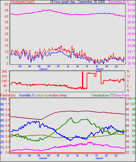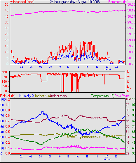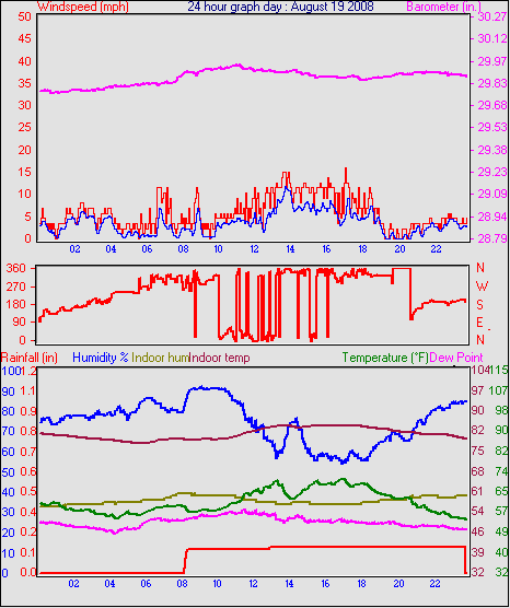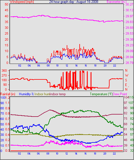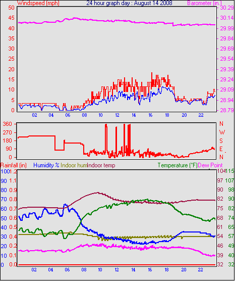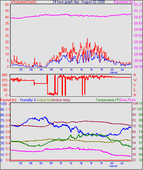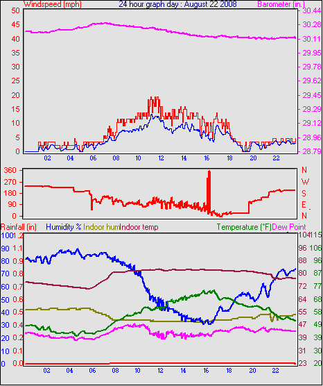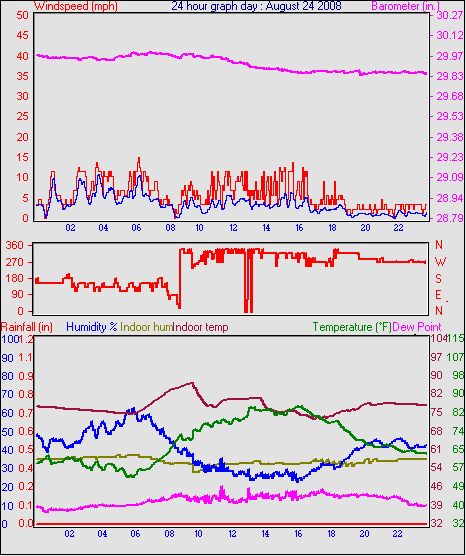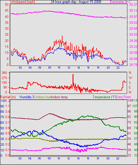 Averages\Extremes for the month of August to 31 2008 ------------------------------------------------------------ Average temperature 65.6 °F Average humidity 49 % Average dewpoint 43.4 °F Average barometer 29.98 in. Average windspeed 3.7 mph Average gustspeed 5.3 mph Average direction 317 ° ( NW) Rainfall for month 0.09 in. Rainfall for year 11.90 in. ----------------------------------------------------------- Maximum rain per minute 0.04 in. on day 08 at time 22:24 Maximum temperature 99.0 °F on day 17 at time 15:06 Minimum temperature 40.6 °F on day 22 at time 04:55 Maximum humidity 97 % on day 20 at time 22:51 Minimum humidity 9 % on day 17 at time 16:19 Maximum pressure 30.30 in. on day 22 at time 07:29 Minimum pressure 29.65 in. on day 18 at time 19:03 Maximum windspeed 28.8 mph from 195° on day 08 at time 09:39 Maximum gust speed 35.7 mph from 158° on day 08 at time 09:38 Maximum heat index 94.7 °F on day 17 at time 14:43 Growing degrees days : 522.1 °F ------------------------------------------------------------ Daily rain totals 0.01 in. on day 1 0.18 in. on day 8 0.15 in. on day 19 0.68 in. on day 20 0.75 in. on day 21 0.01 in. on day 22 0.34 in. on day 25 0.03 in. on day 27 ------------------------------------------------------------