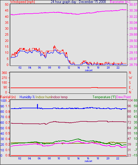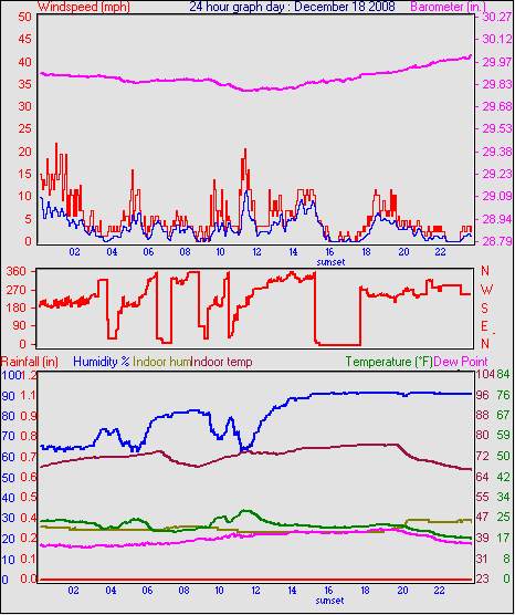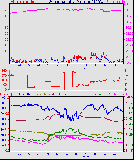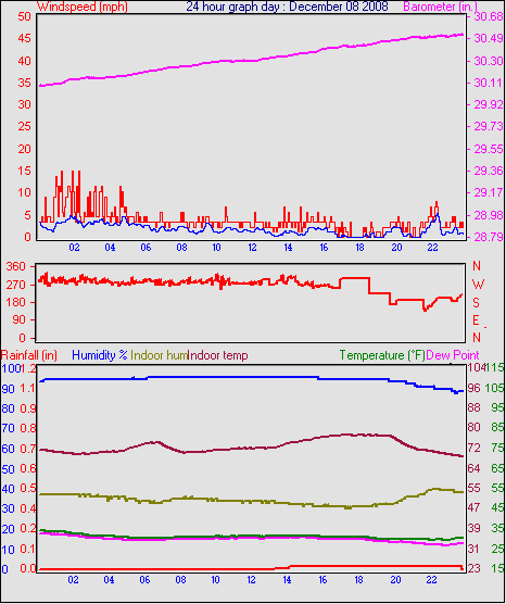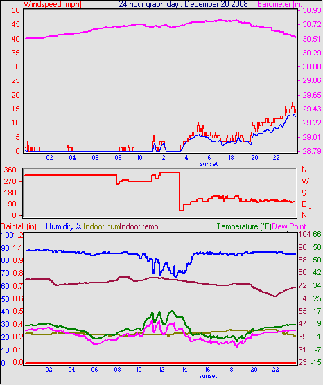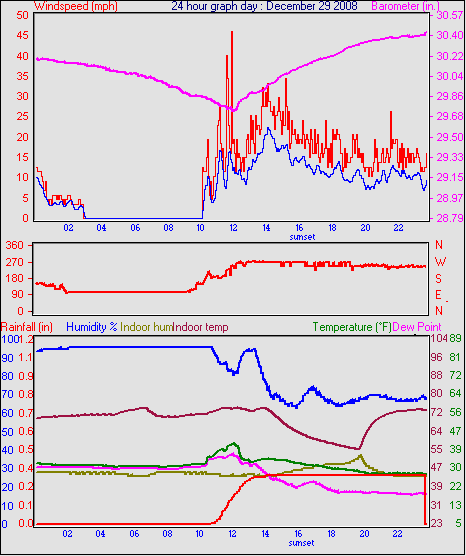 Averages\Extremes for the month of December to 31 2008 ------------------------------------------------------------ Average temperature 24.9 °F Average humidity 84 % Average dewpoint 20.4 °F Average barometer 30.23 in. Average windspeed 4.1 mph Average gustspeed 5.6 mph Average direction 187 ° ( S ) Rainfall for month 0.00 in. Rainfall for year 0.00 in. ----------------------------------------------------------- Maximum rain per minute 0.01 in. on day 28 at time 13:54 Maximum temperature 56.9 °F on day 01 at time 14:45 Minimum temperature -3.8 °F on day 16 at time 21:12 Maximum humidity 100 % on day 26 at time 14:53 Minimum humidity 37 % on day 06 at time 12:29 Maximum pressure 30.79 in. on day 20 at time 17:10 Minimum pressure 29.47 in. on day 12 at time 22:38 Maximum windspeed 26.5 mph from 270° on day 29 at time 14:23 Maximum gust speed 46.0 mph from 228° on day 29 at time 12:13 Maximum heat index 56.9 °F on day 01 at time 14:45 Growing degrees days : 32.0 °F ------------------------------------------------------------ Daily rain totals 0.02 in. on day 1 0.29 in. on day 2 0.01 in. on day 5 0.55 in. on day 7 0.02 in. on day 8 0.02 in. on day 9 0.01 in. on day 10 0.01 in. on day 12 0.40 in. on day 27 0.45 in. on day 28 0.31 in. on day 29 ------------------------------------------------------------