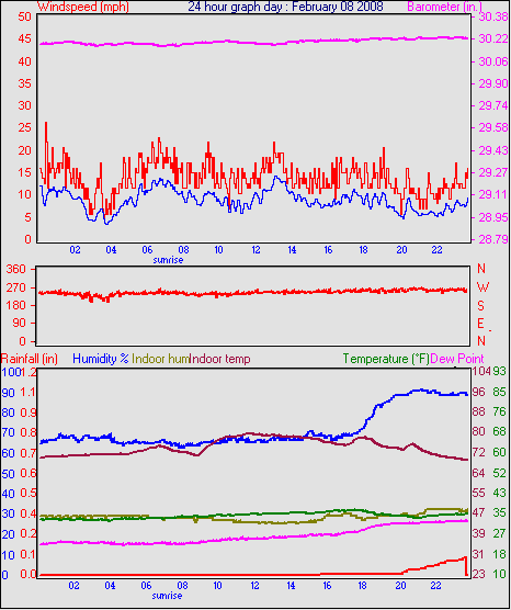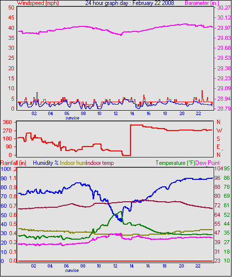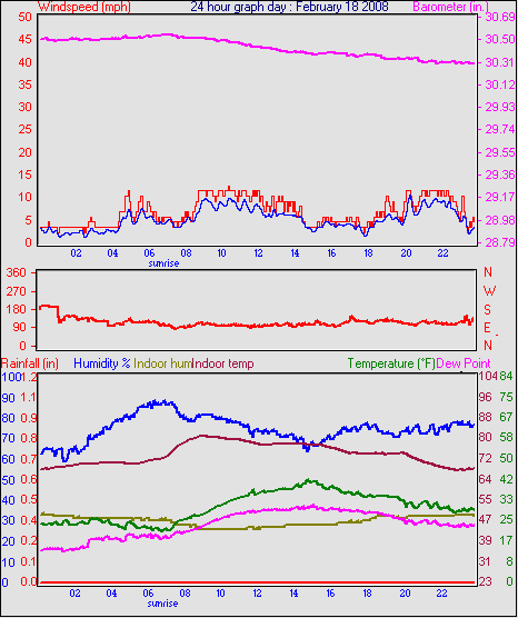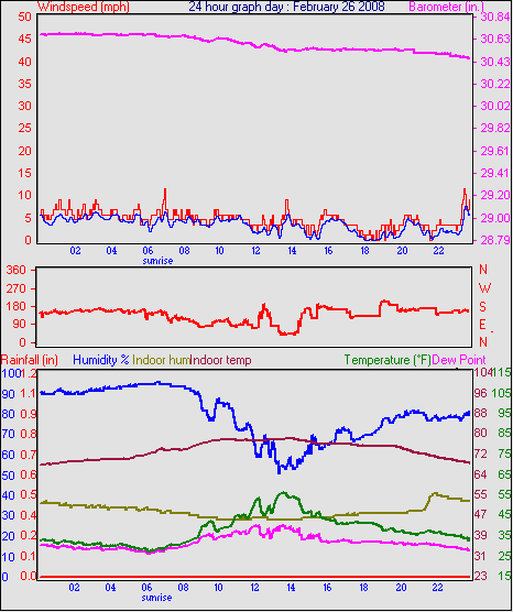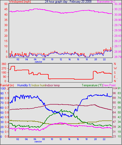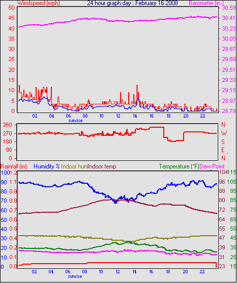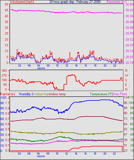 Averages\Extremes for the month of February to 29 2008 ------------------------------------------------------------ Average temperature 33.2 °F Average humidity 79 % Average dewpoint 27.1 °F Average barometer 30.23 in. Average windspeed 4.6 mph Average gustspeed 6.1 mph Average direction 202 ° (SSW) Rainfall for month 0.03 in. Rainfall for year 1.33 in. ----------------------------------------------------------- Maximum rain per minute 0.01 in. on day 25 at time 12:24 Maximum temperature 56.2 °F on day 26 at time 13:46 Minimum temperature 17.7 °F on day 02 at time 07:38 Maximum humidity 100 % on day 23 at time 02:15 Minimum humidity 36 % on day 19 at time 14:38 Maximum pressure 30.69 in. on day 26 at time 02:21 Minimum pressure 29.57 in. on day 03 at time 03:07 Maximum windspeed 23.0 mph from 240° on day 07 at time 06:01 Maximum gust speed 34.5 mph from 251° on day 07 at time 14:45 Maximum heat index 56.2 °F on day 26 at time 13:46 Growing degrees days : 32.0 °F ------------------------------------------------------------ Daily rain totals 0.01 in. on day 3 0.10 in. on day 8 0.16 in. on day 9 0.04 in. on day 10 0.02 in. on day 11 0.05 in. on day 12 0.01 in. on day 13 0.05 in. on day 16 0.01 in. on day 17 0.02 in. on day 24 0.21 in. on day 25 0.10 in. on day 27 ------------------------------------------------------------