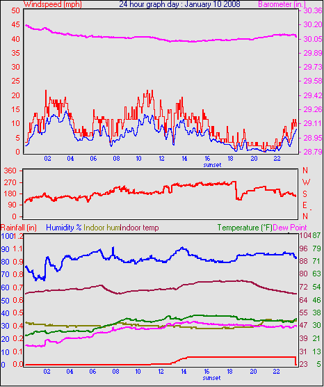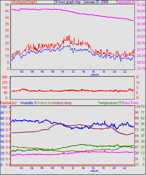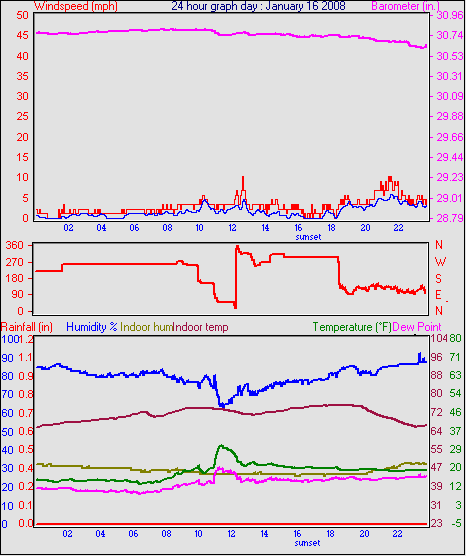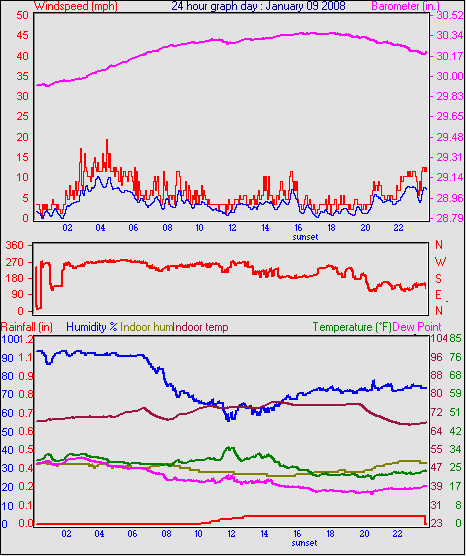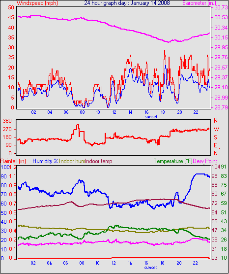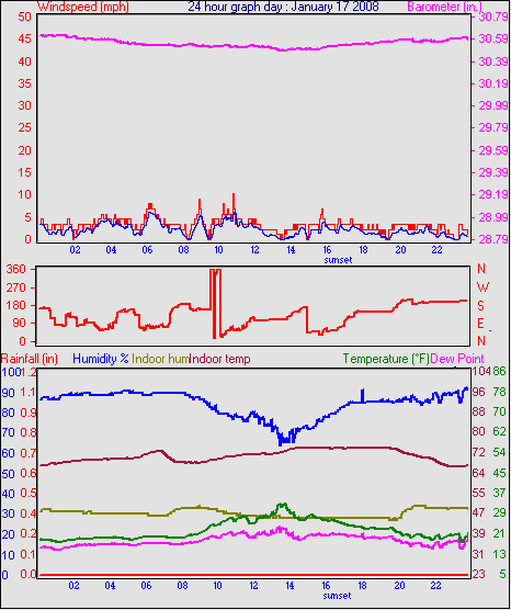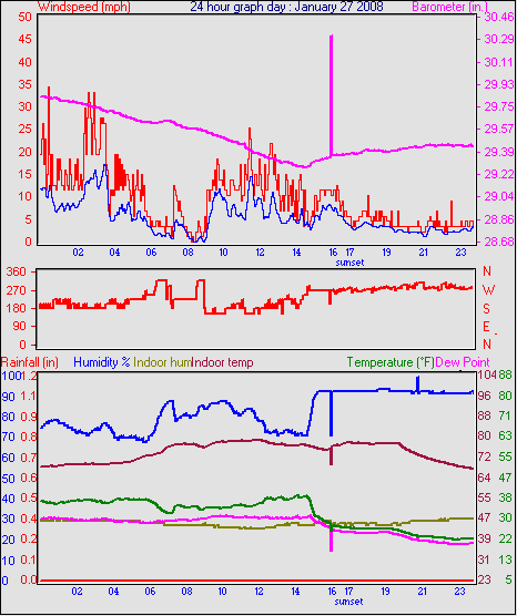 Averages\Extremes for the month of January to 31 2008 ------------------------------------------------------------ Average temperature 28.5 °F Average humidity 78 % Average dewpoint 22.3 °F Average barometer 30.15 in. Average windspeed 5.8 mph Average gustspeed 7.8 mph Average direction 183 ° ( S ) Rainfall for month 0.02 in. Rainfall for year 0.53 in. ----------------------------------------------------------- Maximum rain per minute 0.01 in. on day 30 at time 10:19 Maximum temperature 49.7 °F on day 13 at time 12:16 Minimum temperature 13.4 °F on day 16 at time 06:48 Maximum humidity 100 % on day 27 at time 21:02 Minimum humidity 36 % on day 02 at time 10:35 Maximum pressure 30.91 in. on day 01 at time 02:26 Minimum pressure 29.26 in. on day 04 at time 15:44 Maximum windspeed 38.0 mph from 180° on day 26 at time 18:17 Maximum gust speed 46.0 mph from 180° on day 26 at time 18:17 Maximum heat index 49.7 °F on day 13 at time 12:16 Growing degrees days : 32.0 °F ------------------------------------------------------------ Daily rain totals 0.01 in. on day 7 0.05 in. on day 9 0.07 in. on day 10 0.13 in. on day 11 0.01 in. on day 12 0.01 in. on day 14 0.11 in. on day 28 0.03 in. on day 29 0.01 in. on day 30 ------------------------------------------------------------