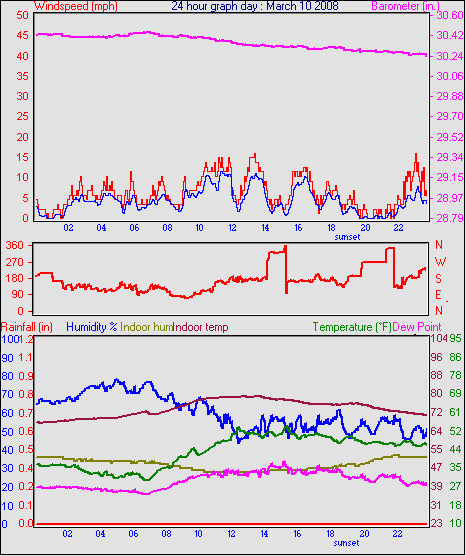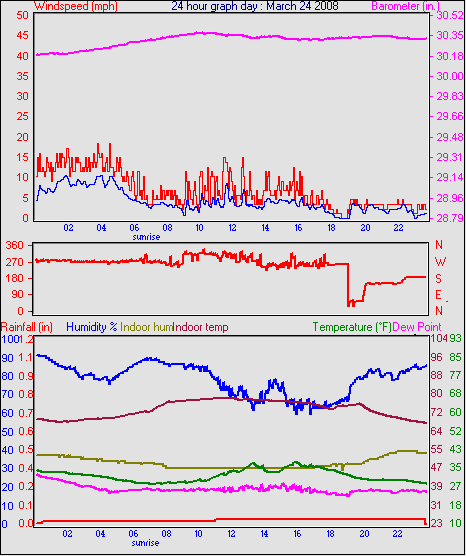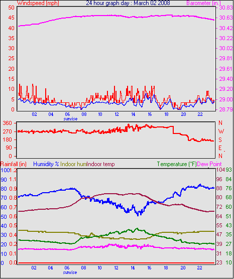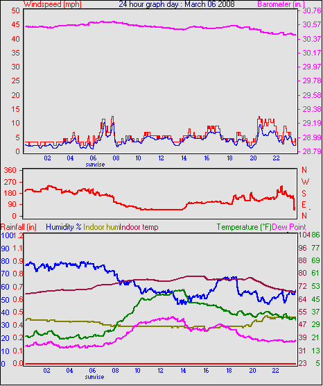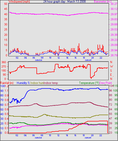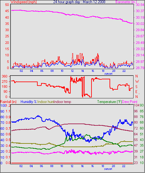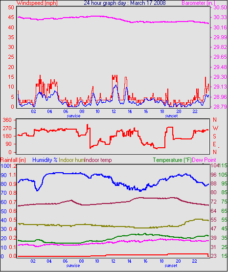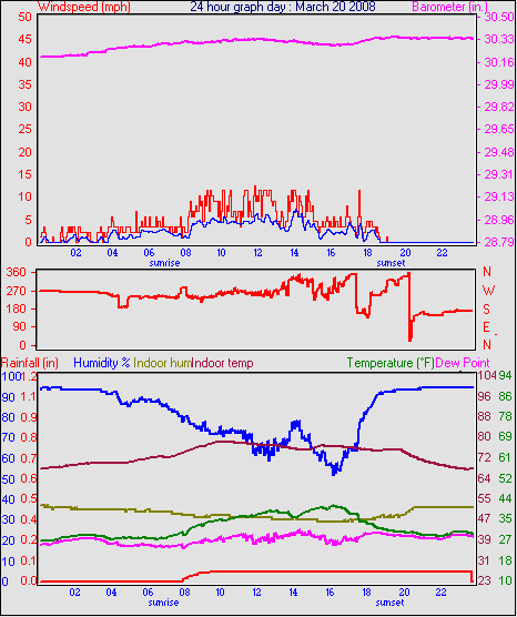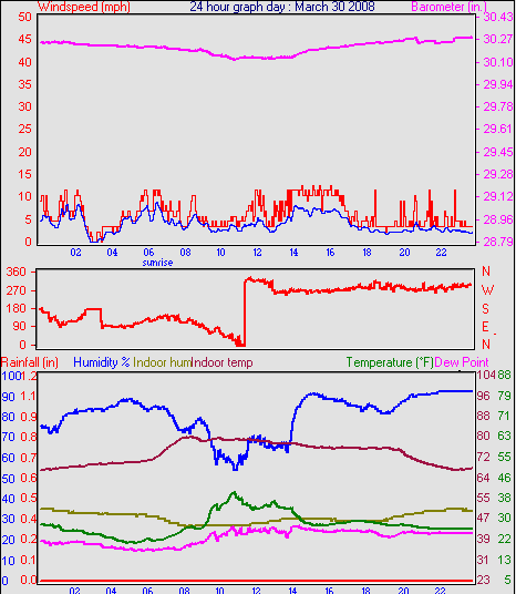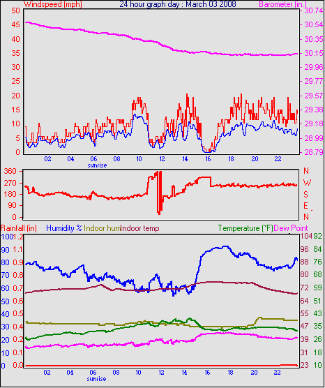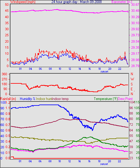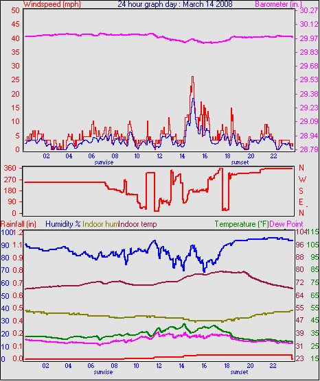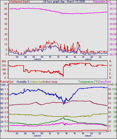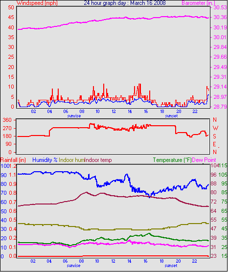 Averages\Extremes for the month of March to 31 2008 ------------------------------------------------------------ Average temperature 33.1 °F Average humidity 78 % Average dewpoint 26.6 °F Average barometer 30.31 in. Average windspeed 3.8 mph Average gustspeed 5.2 mph Average direction 214 ° (SSW) Rainfall for month 0.07 in. Rainfall for year 3.44 in. ----------------------------------------------------------- Maximum rain per minute 0.01 in. on day 23 at time 23:30 Maximum temperature 54.5 °F on day 10 at time 15:33 Minimum temperature 19.7 °F on day 22 at time 07:15 Maximum humidity 100 % on day 31 at time 14:11 Minimum humidity 36 % on day 12 at time 15:35 Maximum pressure 30.85 in. on day 22 at time 07:21 Minimum pressure 29.87 in. on day 28 at time 19:06 Maximum windspeed 20.7 mph from 109° on day 28 at time 10:16 Maximum gust speed 32.2 mph from 254° on day 18 at time 17:58 Maximum heat index 54.5 °F on day 10 at time 15:33 Growing degrees days : 32.0 °F ------------------------------------------------------------ Daily rain totals 0.01 in. on day 3 0.18 in. on day 4 0.07 in. on day 5 0.03 in. on day 8 0.14 in. on day 11 0.30 in. on day 13 0.04 in. on day 14 0.29 in. on day 15 0.01 in. on day 16 0.03 in. on day 17 0.15 in. on day 18 0.02 in. on day 19 0.06 in. on day 20 0.22 in. on day 21 0.22 in. on day 23 0.03 in. on day 24 0.04 in. on day 27 0.02 in. on day 29 0.04 in. on day 31 ------------------------------------------------------------