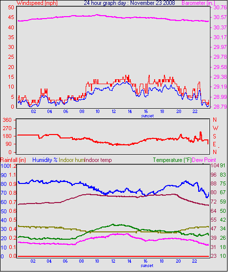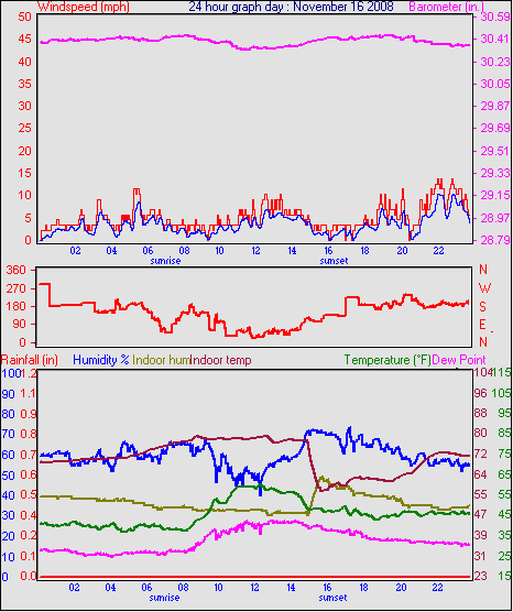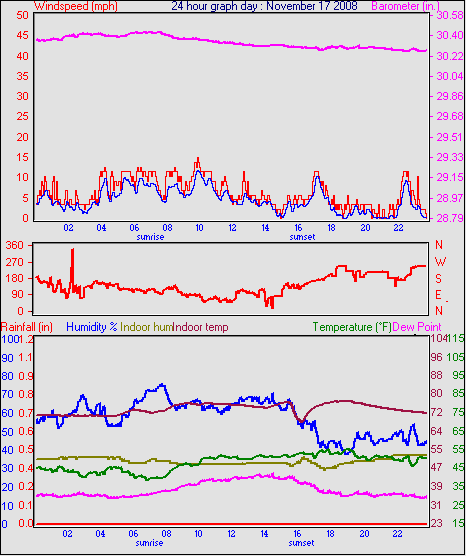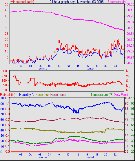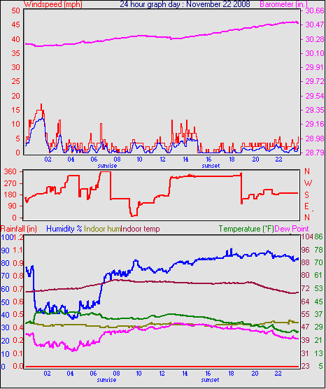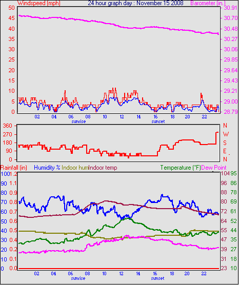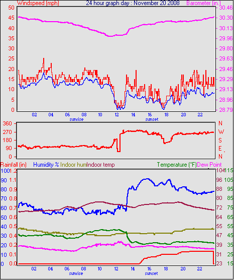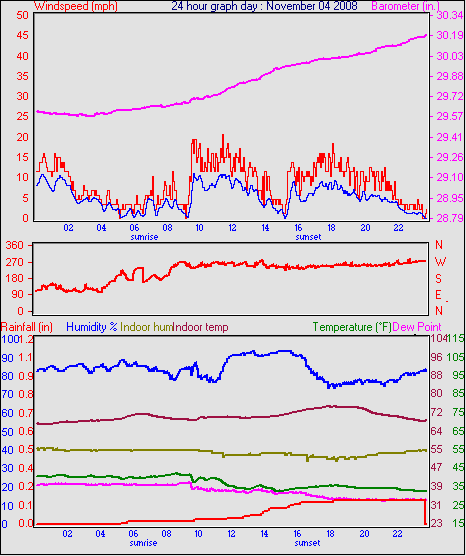 Averages\Extremes for the month of November to 30 2008 ------------------------------------------------------------ Average temperature 39.7 °F Average humidity 81 % Average dewpoint 33.9 °F Average barometer 30.29 in. Average windspeed 3.9 mph Average gustspeed 5.3 mph Average direction 151 ° (SSE) Rainfall for month 0.12 in. Rainfall for year 16.86 in. ----------------------------------------------------------- Maximum rain per minute 0.01 in. on day 12 at time 23:07 Maximum temperature 60.6 °F on day 16 at time 12:32 Minimum temperature 25.1 °F on day 23 at time 06:50 Maximum humidity 100 % on day 02 at time 23:05 Minimum humidity 37 % on day 22 at time 04:36 Maximum pressure 30.82 in. on day 14 at time 18:39 Minimum pressure 29.57 in. on day 04 at time 03:40 Maximum windspeed 23.0 mph from 249° on day 12 at time 11:58 Maximum gust speed 33.4 mph from 245° on day 12 at time 19:51 Maximum heat index 60.6 °F on day 16 at time 12:32 Growing degrees days : 32.0 °F ------------------------------------------------------------ Daily rain totals 0.33 in. on day 2 0.15 in. on day 4 0.03 in. on day 5 0.02 in. on day 6 0.15 in. on day 7 0.08 in. on day 8 0.17 in. on day 9 0.04 in. on day 10 0.14 in. on day 11 0.94 in. on day 12 0.36 in. on day 14 0.16 in. on day 20 0.05 in. on day 26 0.01 in. on day 27 0.18 in. on day 28 0.29 in. on day 29 0.01 in. on day 30 ------------------------------------------------------------