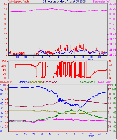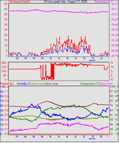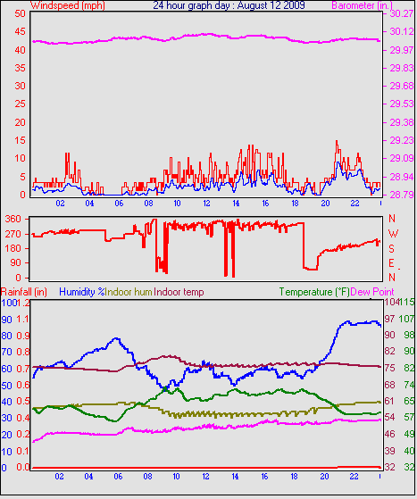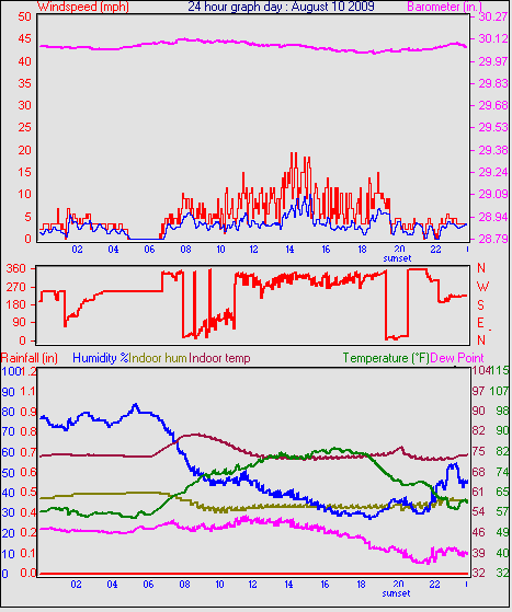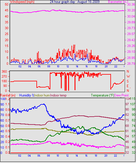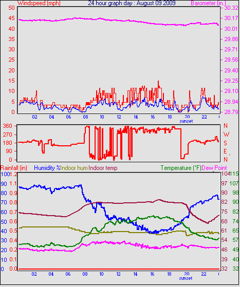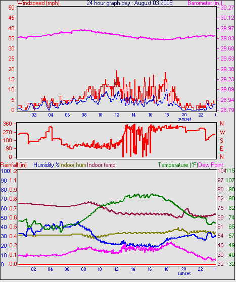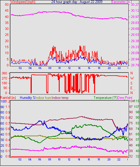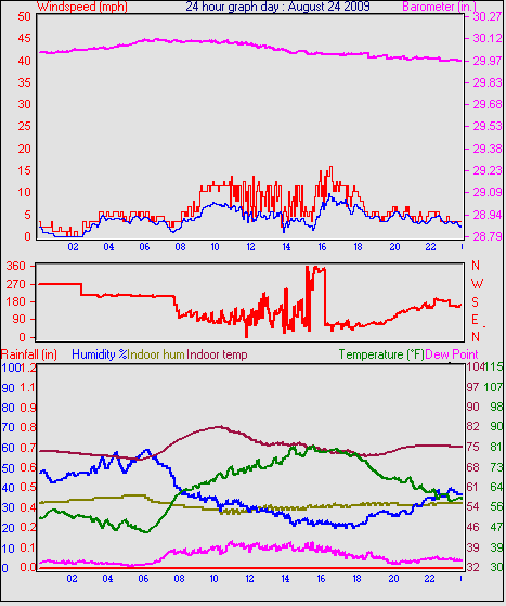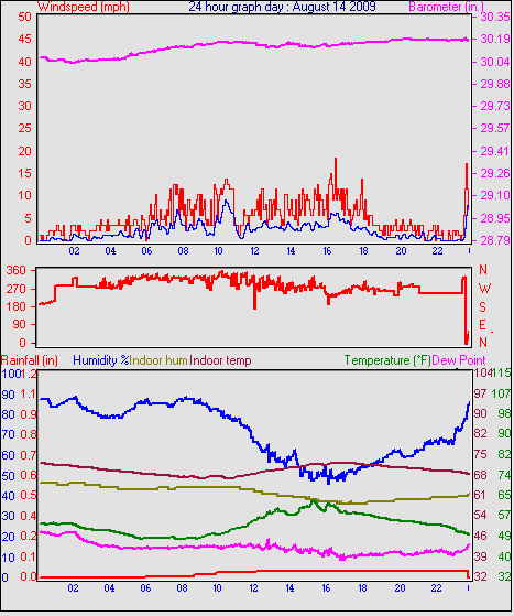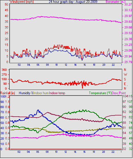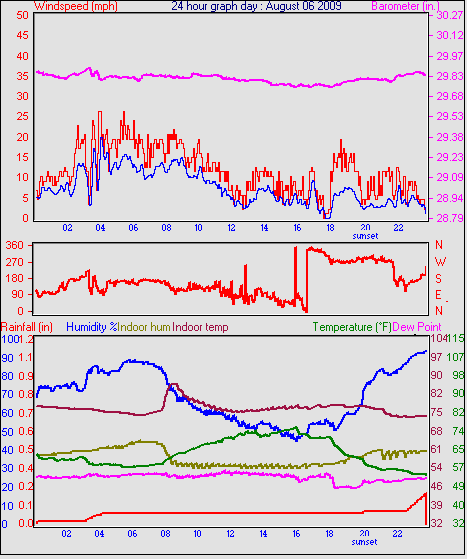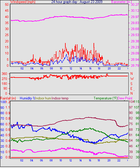 Maximum windspeed = 23.0 mph from 135°( SE) on day 06 at time 04:14