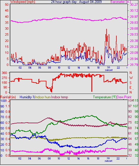 Maximum gust speed = 29.9 mph from 203°(SSW) on day 04 at time 19:53