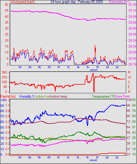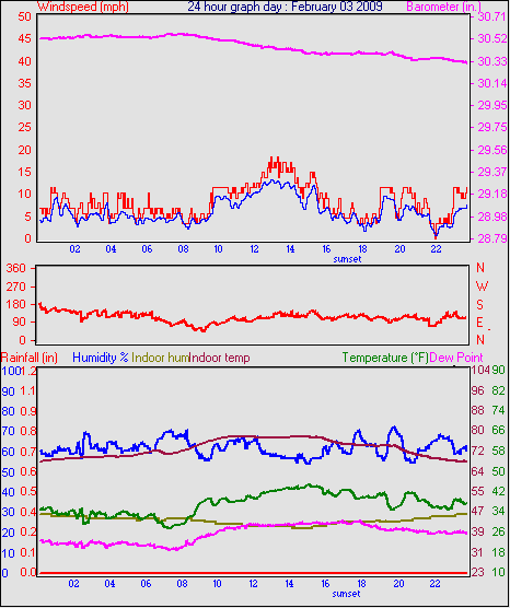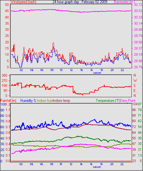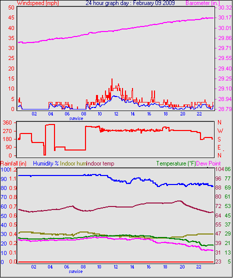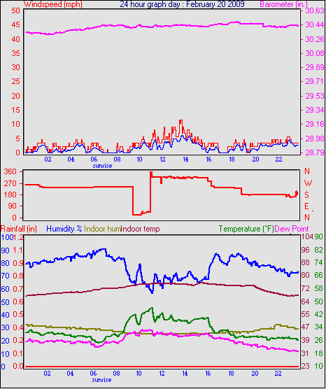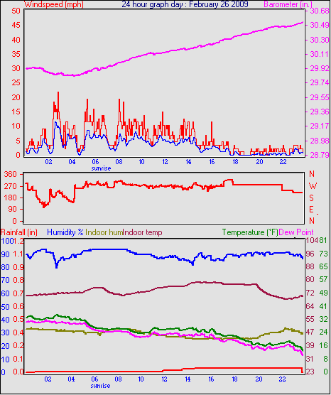 Averages\Extremes for the month of February to 28 2009 ------------------------------------------------------------ Average temperature 32.5 °F Average humidity 77 % Average dewpoint 25.7 °F Average barometer 30.23 in. Average windspeed 3.8 mph Average gustspeed 5.0 mph Average direction 143 ° ( SE) Rainfall for month 0.02 in. Rainfall for year 2.75 in. ----------------------------------------------------------- Maximum rain per minute 0.01 in. on day 23 at time 22:33 Maximum temperature 54.9 °F on day 04 at time 12:15 Minimum temperature 11.8 °F on day 27 at time 06:32 Maximum humidity 100 % on day 11 at time 08:53 Minimum humidity 42 % on day 14 at time 12:05 Maximum pressure 30.74 in. on day 01 at time 09:32 Minimum pressure 29.71 in. on day 08 at time 15:34 Maximum windspeed 31.1 mph from 165° on day 23 at time 19:25 Maximum gust speed 43.7 mph from 165° on day 23 at time 19:25 Maximum heat index 54.9 °F on day 04 at time 12:15 Growing degrees days : 32.0 °F ------------------------------------------------------------ Daily rain totals 0.03 in. on day 5 0.04 in. on day 6 0.01 in. on day 10 0.01 in. on day 11 0.02 in. on day 22 0.25 in. on day 23 0.10 in. on day 24 0.05 in. on day 25 0.04 in. on day 26 0.02 in. on day 28 ------------------------------------------------------------