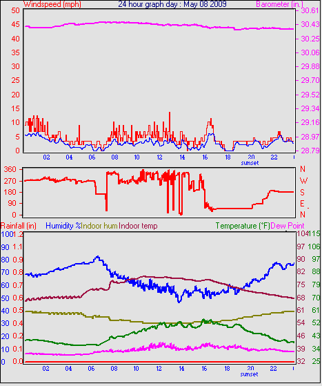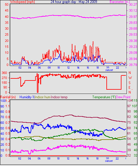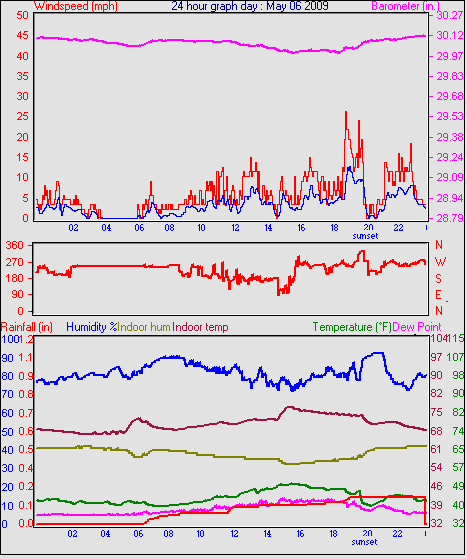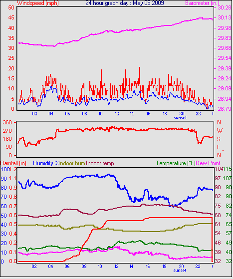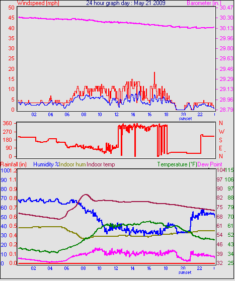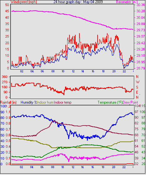 Maximum windspeed = 21.9 mph from 180°( S ) on day 04 at time 19:05