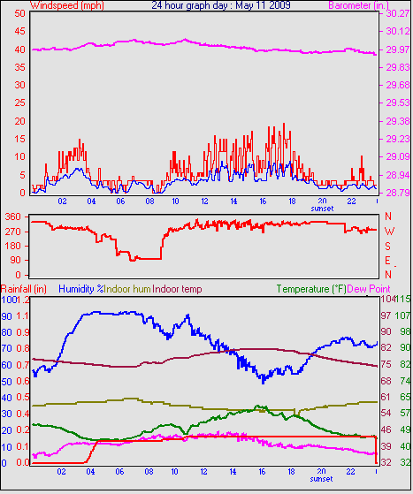 Maximum gust speed = 16 mph from 090 °( E ) on day 29 at time 23:49