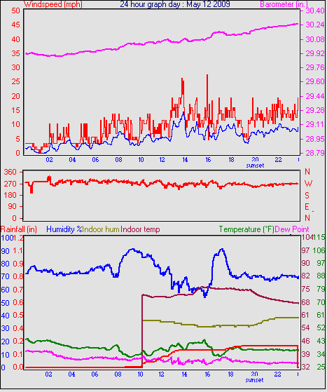 Maximum gust speed = 27.6 mph from 248°(WSW) on day 12 at time 16:08