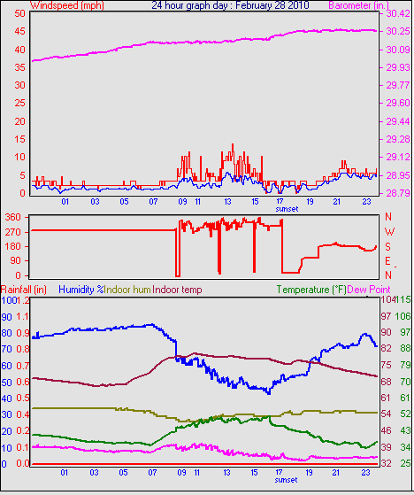 Maximum gust speed = 14 mph from 315 °( NW) on day 28 at time 13:34