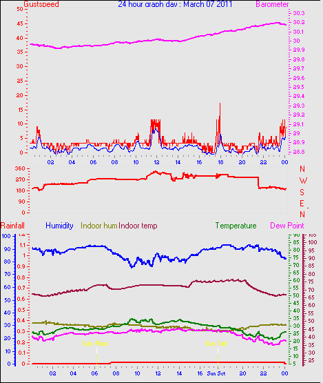 Maximum gust speed = 17.3 mph from 338 °(NNW) on day 07 at time 17:55