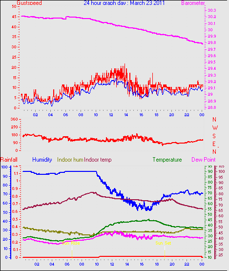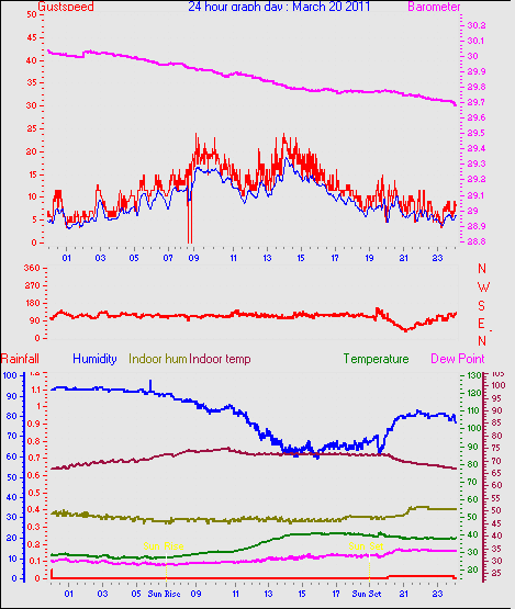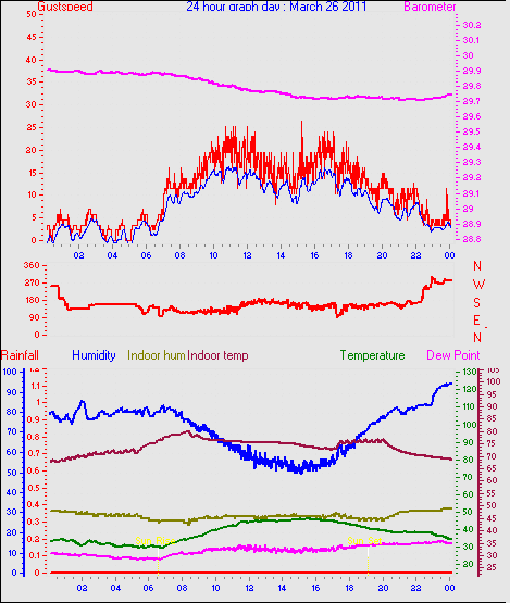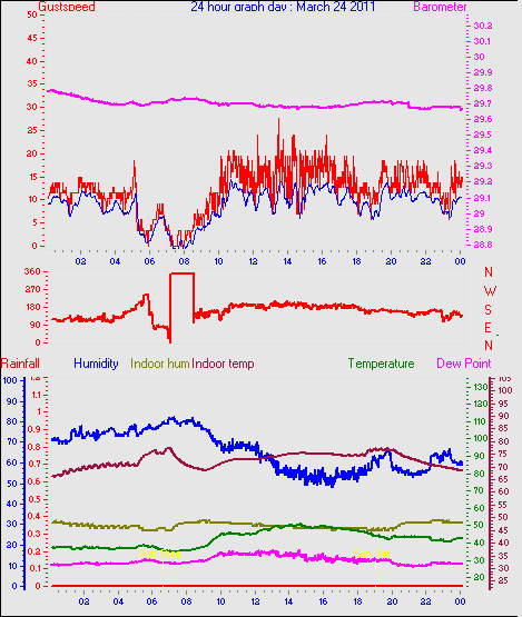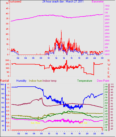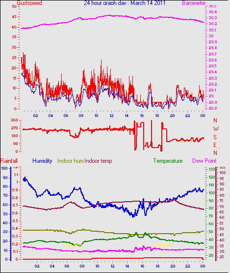 Maximum windspeed = 27.6 mph from 203°(SSW) on day 10 at time 08:14