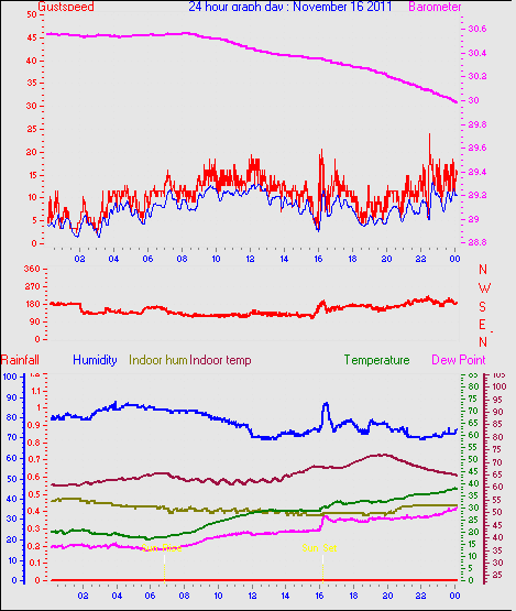 Maximum gust speed = 16.1 mph from 203 °(SSW) on day 29 at time 18:26