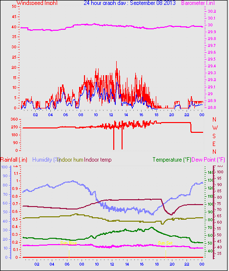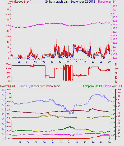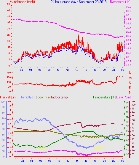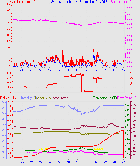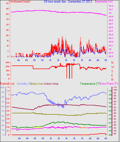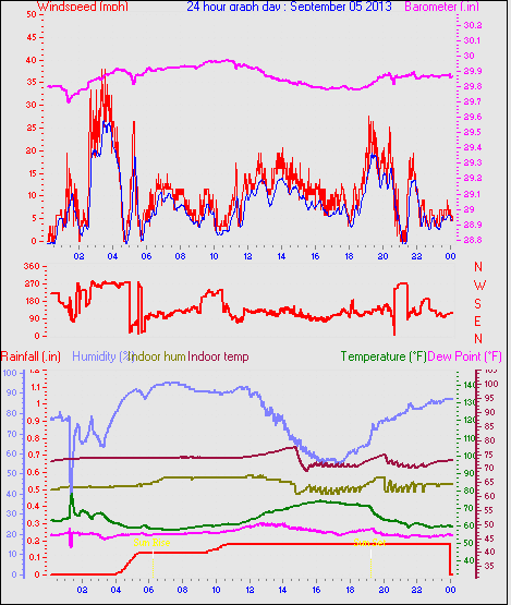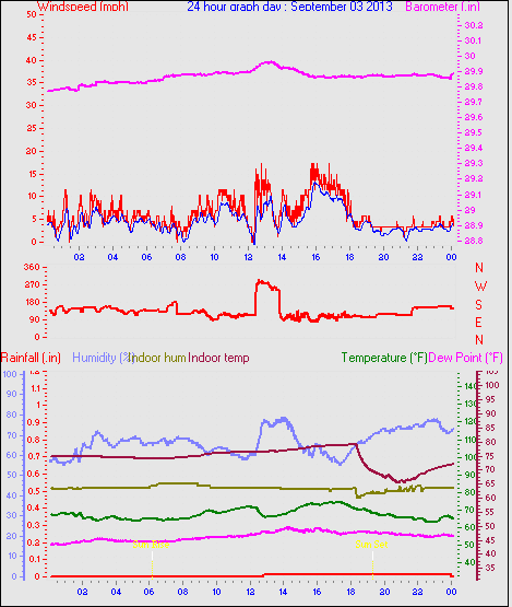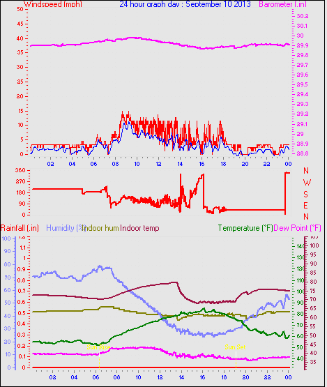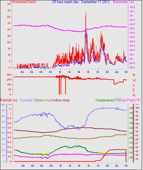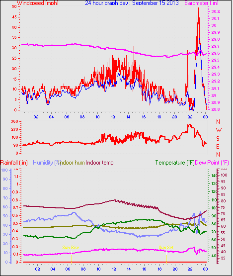 Maximum windspeed = 40.3 mph from 225°( SW) on day 15 at time 23:07