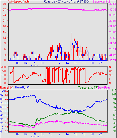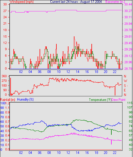 Averages\Extremes for the month of August to 29 2004 --------------------------------------------------- Average temperature 67.7 °F (19.8 °C) Average humidity 54 % Average dewpoint 48.2 °F (9.0 °C) Average barometer 30.205 in. Average windspeed 4.9 mph Average gustspeed 4.9 mph Average direction 288 ° (WNW) Rainfall for month 2.707 in. (68 mm) Rainfall for year 19.885 in. (497 mm) ----------------------------------------------------------- Maximum rain per minute 0.000 in. ( 0 mm) on day 29 at time 23:56 Maximum temperature 103.6 °F (39.8 °C) on day 13 at time 10:49 Minimum temperature 32.0 °F (0.0 °C) on day 22 at time 16:13 Maximum humidity 95 % on day 25 at time 10:03 Minimum humidity 5 % on day 22 at time 16:13 Minimum pressure 29.905 in. on day 22 at time 20:51 Maximum pressure 30.466 in. on day 08 at time 13:48 Maximum windspeed 23.0 mph from 200 on day 02 at time 18:07 Maximum gust speed 32.0 mph from 035 on day 04 at time 20:15 Maximum heat index 107.6 °F (42.0 °C)on day 21 at time 11:52 Growing degrees days : 623.5 °F Sunshine hours year to date= 0.0 hrs ------------------------------------------------------------ Daily rain totals 0.04 in. (1.1 mm) on day 1 0.07 in. (1.8 mm) on day 2 0.06 in. (1.4 mm) on day 3 0.01 in. (0.4 mm) on day 4 0.37 in. (9.2 mm) on day 5 0.01 in. (0.4 mm) on day 6 0.01 in. (0.4 mm) on day 18 0.60 in. (14.9 mm) on day 21 0.37 in. (9.2 mm) on day 22 0.44 in. (11.0 mm) on day 23 0.72 in. (18.1 mm) on day 24 ------------------------------------------------------------