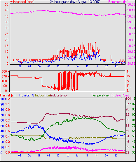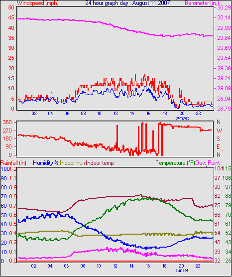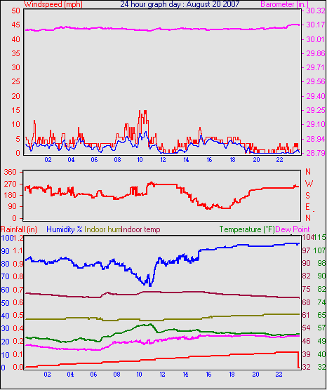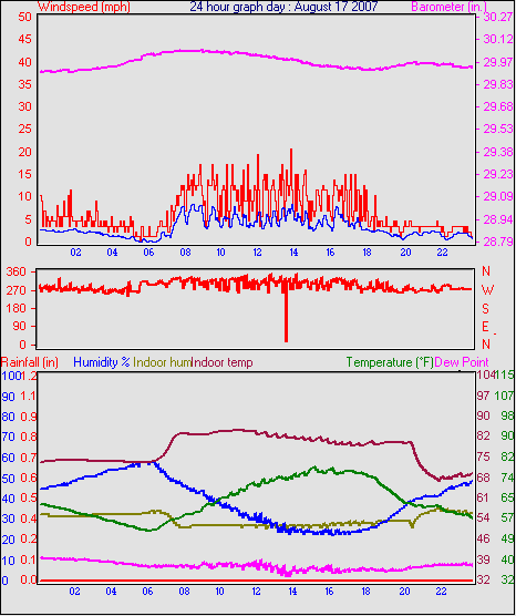 Averages\Extremes for the month of August to 31 2007 ------------------------------------------------------------ Average temperature 66.3 °F Average humidity 39 % Average dewpoint 37.8 °F Average barometer 29.98 in. Average windspeed 3.4 mph Average gustspeed 5.0 mph Average direction 307 ° ( NW) Rainfall for month 0.02 in. Rainfall for year 8.51 in. ----------------------------------------------------------- Maximum rain per minute 0.01 in. on day 19 at time 21:54 Maximum temperature 95.7 °F on day 15 at time 14:34 Minimum temperature 43.9 °F on day 27 at time 04:58 Maximum humidity 96 % on day 20 at time 00:40 Minimum humidity 10 % on day 15 at time 15:18 Maximum pressure 30.25 in. on day 28 at time 07:08 Minimum pressure 29.71 in. on day 16 at time 02:59 Maximum windspeed 23.0 mph from 338° on day 26 at time 14:58 Maximum gust speed 29.9 mph from 306° on day 10 at time 16:29 Maximum heat index 90.9 °F on day 15 at time 14:34 Growing degrees days : 514.5 °F ------------------------------------------------------------ Daily rain totals 0.19 in. on day 19 0.14 in. on day 20 0.11 in. on day 21 0.05 in. on day 22 0.01 in. on day 23 0.05 in. on day 31 ------------------------------------------------------------