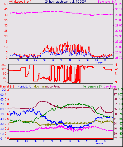 Averages\Extremes for the month of July to 31 2007 ------------------------------------------------------------ Average temperature 74.4 °F Average humidity 40 % Average dewpoint 46.5 °F Average barometer 29.96 in. Average windspeed 3.1 mph Average gustspeed 4.3 mph Average direction 306 ° ( NW) Rainfall for month 0.00 in. Rainfall for year 7.96 in. ----------------------------------------------------------- Maximum rain per minute 0.01 in. on day 17 at time 17:49 Maximum temperature 103.9 °F on day 05 at time 16:40 Minimum temperature 49.2 °F on day 31 at time 04:03 Maximum humidity 82 % on day 19 at time 06:29 Minimum humidity 12 % on day 05 at time 16:41 Maximum pressure 30.26 in. on day 03 at time 05:41 Minimum pressure 29.74 in. on day 18 at time 08:44 Maximum windspeed 28.8 mph from 137° on day 13 at time 19:44 Maximum gust speed 34.5 mph from 137° on day 13 at time 19:44 Maximum heat index 102.3 °F on day 05 at time 14:18 Growing degrees days : 683.6 °F ------------------------------------------------------------ Daily rain totals 0.01 in. on day 17 ------------------------------------------------------------
