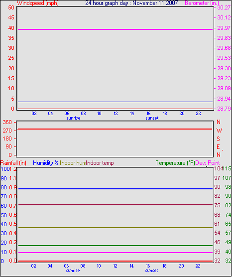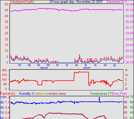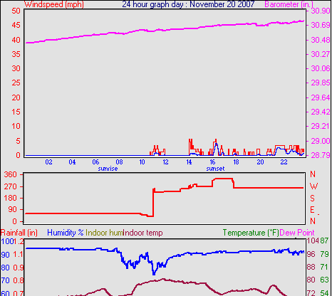 Averages\Extremes for the month of November to 28 2007 ------------------------------------------------------------ Average temperature 35.3 °F Average humidity 75 % Average dewpoint 27.2 °F Average barometer 30.34 in. Average windspeed 3.0 mph Average gustspeed 3.6 mph Average direction 192 ° (SSW) Rainfall for month 1.91 in. Rainfall for year 12.44 in. ----------------------------------------------------------- Maximum rain per minute 0.01 in. on day 17 at time 18:03 Maximum temperature 64.6 °F on day 08 at time 11:37 Minimum temperature 6.9 °F on day 22 at time 01:20 Maximum humidity 100 % on day 25 at time 03:23 Minimum humidity 33 % on day 08 at time 13:02 Maximum pressure 30.84 in. on day 22 at time 07:24 Minimum pressure 29.84 in. on day 12 at time 18:56 Maximum windspeed 25.3 mph from 203° on day 12 at time 13:11 Maximum gust speed 40.3 mph from 203° on day 12 at time 13:11 Maximum heat index 78.2 °F on day 08 at time 11:31 Growing degrees days : 32.0 °F ------------------------------------------------------------ Daily rain totals 0.17 in. on day 10 0.49 in. on day 12 0.01 in. on day 14 0.17 in. on day 15 0.21 in. on day 16 0.39 in. on day 17 0.08 in. on day 18 0.02 in. on day 19 0.20 in. on day 20 0.12 in. on day 21 0.02 in. on day 22 0.01 in. on day 24 0.01 in. on day 25 0.01 in. on day 28 ------------------------------------------------------------