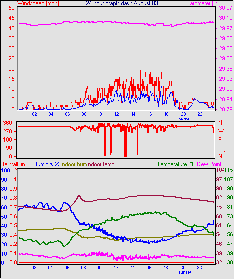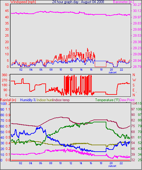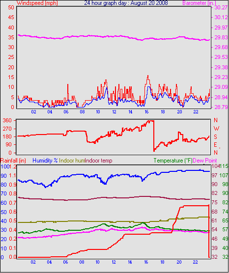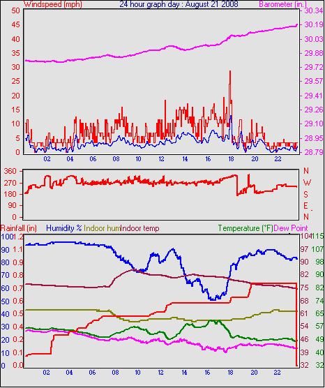 Averages\Extremes for the month of August to 31 2008 ------------------------------------------------------------ Average temperature 65.6 °F Average humidity 49 % Average dewpoint 43.4 °F Average barometer 29.98 in. Average windspeed 3.7 mph Average gustspeed 5.3 mph Average direction 317 ° ( NW) Rainfall for month 0.09 in. Rainfall for year 11.90 in. ----------------------------------------------------------- Maximum rain per minute 0.04 in. on day 08 at time 22:24 Maximum temperature 99.0 °F on day 17 at time 15:06 Minimum temperature 40.6 °F on day 22 at time 04:55 Maximum humidity 97 % on day 20 at time 22:51 Minimum humidity 9 % on day 17 at time 16:19 Maximum pressure 30.30 in. on day 22 at time 07:29 Minimum pressure 29.65 in. on day 18 at time 19:03 Maximum windspeed 28.8 mph from 195° on day 08 at time 09:39 Maximum gust speed 35.7 mph from 158° on day 08 at time 09:38 Maximum heat index 94.7 °F on day 17 at time 14:43 Growing degrees days : 522.1 °F ------------------------------------------------------------ Daily rain totals 0.01 in. on day 1 0.18 in. on day 8 0.15 in. on day 19 0.68 in. on day 20 0.75 in. on day 21 0.01 in. on day 22 0.34 in. on day 25 0.03 in. on day 27 ------------------------------------------------------------