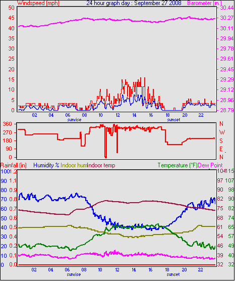 Averages\Extremes for the month of September to 30 2008 ------------------------------------------------------------ Average temperature 58.9 °F Average humidity 46 % Average dewpoint 36.2 °F Average barometer 30.12 in. Average windspeed 3.6 mph Average gustspeed 5.1 mph Average direction 147 ° (SSE) Rainfall for month 0.04 in. Rainfall for year 12.82 in. ----------------------------------------------------------- Maximum rain per minute 0.01 in. on day 21 at time 05:56 Maximum temperature 89.6 °F on day 17 at time 15:20 Minimum temperature 34.2 °F on day 23 at time 04:51 Maximum humidity 99 % on day 20 at time 22:08 Minimum humidity 10 % on day 17 at time 15:42 Maximum pressure 30.44 in. on day 23 at time 07:41 Minimum pressure 29.79 in. on day 09 at time 16:57 Maximum windspeed 18.4 mph from 317° on day 25 at time 14:45 Maximum gust speed 25.3 mph from 326° on day 04 at time 13:50 Maximum heat index 85.5 °F on day 17 at time 15:20 Growing degrees days : 370.1 °F ------------------------------------------------------------ Daily rain totals 0.33 in. on day 20 0.43 in. on day 21 0.16 in. on day 22 ------------------------------------------------------------