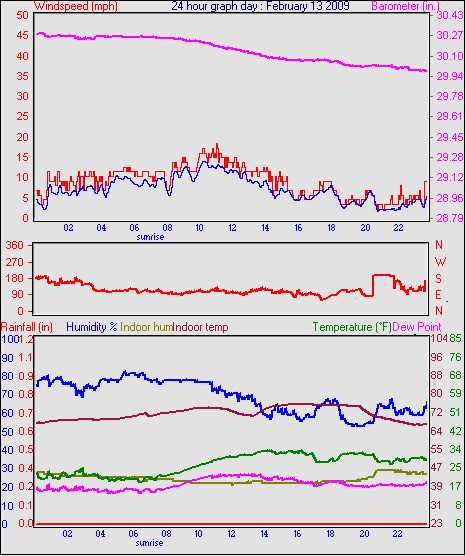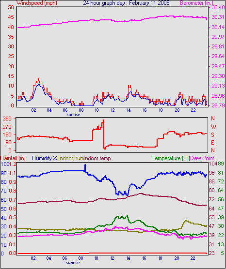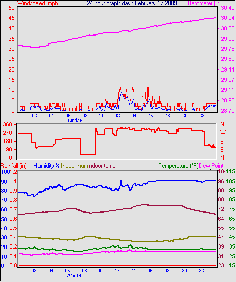 Averages\Extremes for the month of February to 28 2009 ------------------------------------------------------------ Average temperature 32.5 °F Average humidity 77 % Average dewpoint 25.7 °F Average barometer 30.23 in. Average windspeed 3.8 mph Average gustspeed 5.0 mph Average direction 143 ° ( SE) Rainfall for month 0.02 in. Rainfall for year 2.75 in. ----------------------------------------------------------- Maximum rain per minute 0.01 in. on day 23 at time 22:33 Maximum temperature 54.9 °F on day 04 at time 12:15 Minimum temperature 11.8 °F on day 27 at time 06:32 Maximum humidity 100 % on day 11 at time 08:53 Minimum humidity 42 % on day 14 at time 12:05 Maximum pressure 30.74 in. on day 01 at time 09:32 Minimum pressure 29.71 in. on day 08 at time 15:34 Maximum windspeed 31.1 mph from 165° on day 23 at time 19:25 Maximum gust speed 43.7 mph from 165° on day 23 at time 19:25 Maximum heat index 54.9 °F on day 04 at time 12:15 Growing degrees days : 32.0 °F ------------------------------------------------------------ Daily rain totals 0.03 in. on day 5 0.04 in. on day 6 0.01 in. on day 10 0.01 in. on day 11 0.02 in. on day 22 0.25 in. on day 23 0.10 in. on day 24 0.05 in. on day 25 0.04 in. on day 26 0.02 in. on day 28 ------------------------------------------------------------