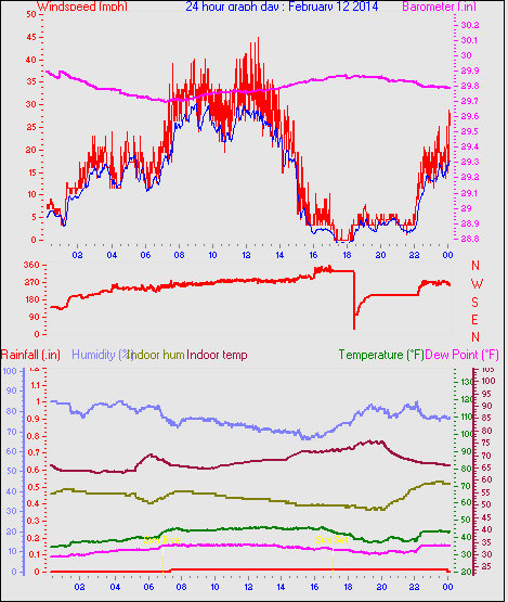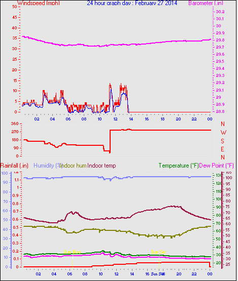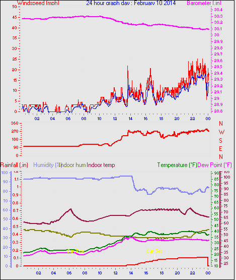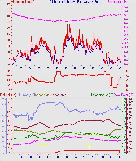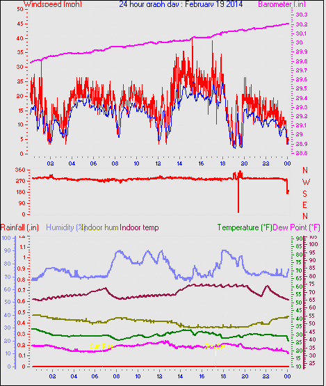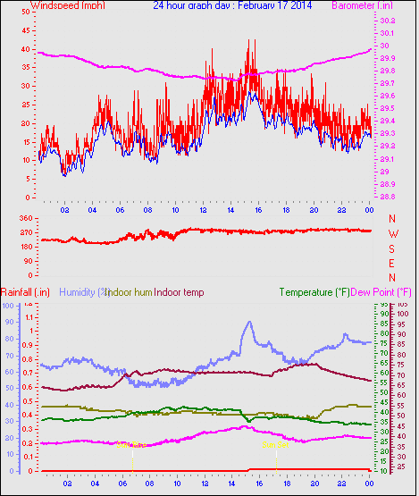 Maximum windspeed = 38.0 mph from 293°(WNW) on day 13 at time 05:14