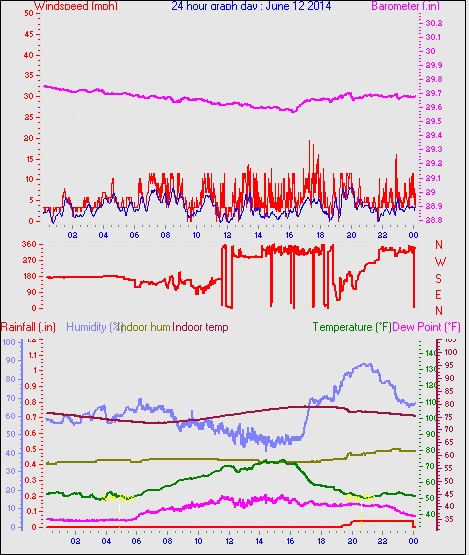Maximum gust speed = 15.0 mph from 293 °(WNW) on day 29 at time 13:27