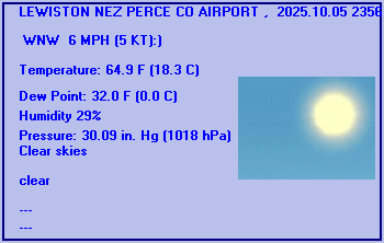 LEWISTON NEZ PERCE CO AIRPORT , ID, United States (KLWS) 46-22N 117-01W 438M Oct 05, 2025 - 06:56 PM EDT / 2025.10.05 2256 UTC Wind: from the WNW (290 degrees) at 8 MPH (7 KT):0 Visibility: 10 mile(s):0 Sky conditions: clear Temperature: 64.9 F (18.3 C) Dew Point: 34.0 F (1.1 C) Relative Humidity: 31% Pressure (altimeter): 30.09 in. Hg (1018 hPa) ob: KLWS 052256Z 29007KT 10SM CLR 18/01 A3009 RMK AO2 SLP187 T01830011 cycle: 23